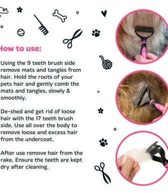 Ontklithark van professionele kwaliteit voor honden en katten met een middellange tot lange vacht. De hark met dubbele kop is geschikt voor de gevoelige huid en is ontworpen om klitten en klitten met gemak te verwijderen.