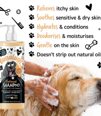 Bugalugs Oatmeal Shampoo is een milde, pH-gebalanceerde havermoutshampoo voor honden. De shampoo is verrijkt met essentiële oliën, colloïdale havermout en aloë vera om een ​​droge, jeukende en geïrriteerde huid te verzachten.