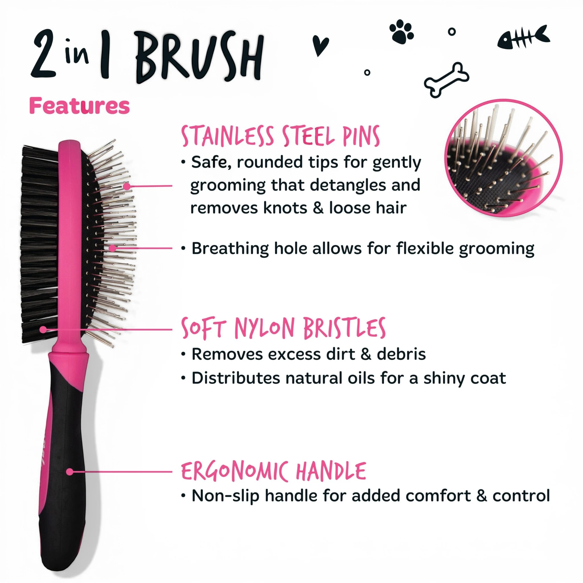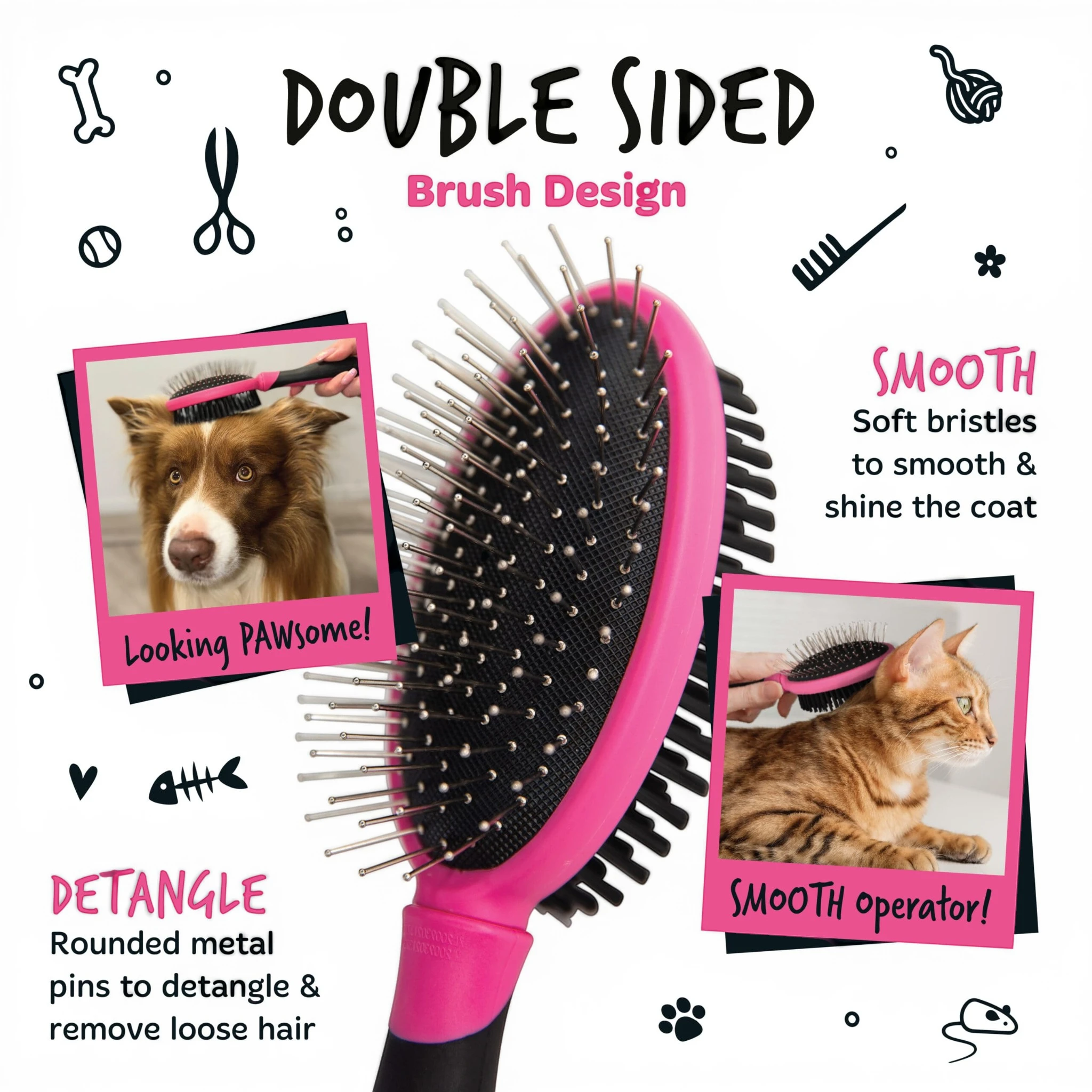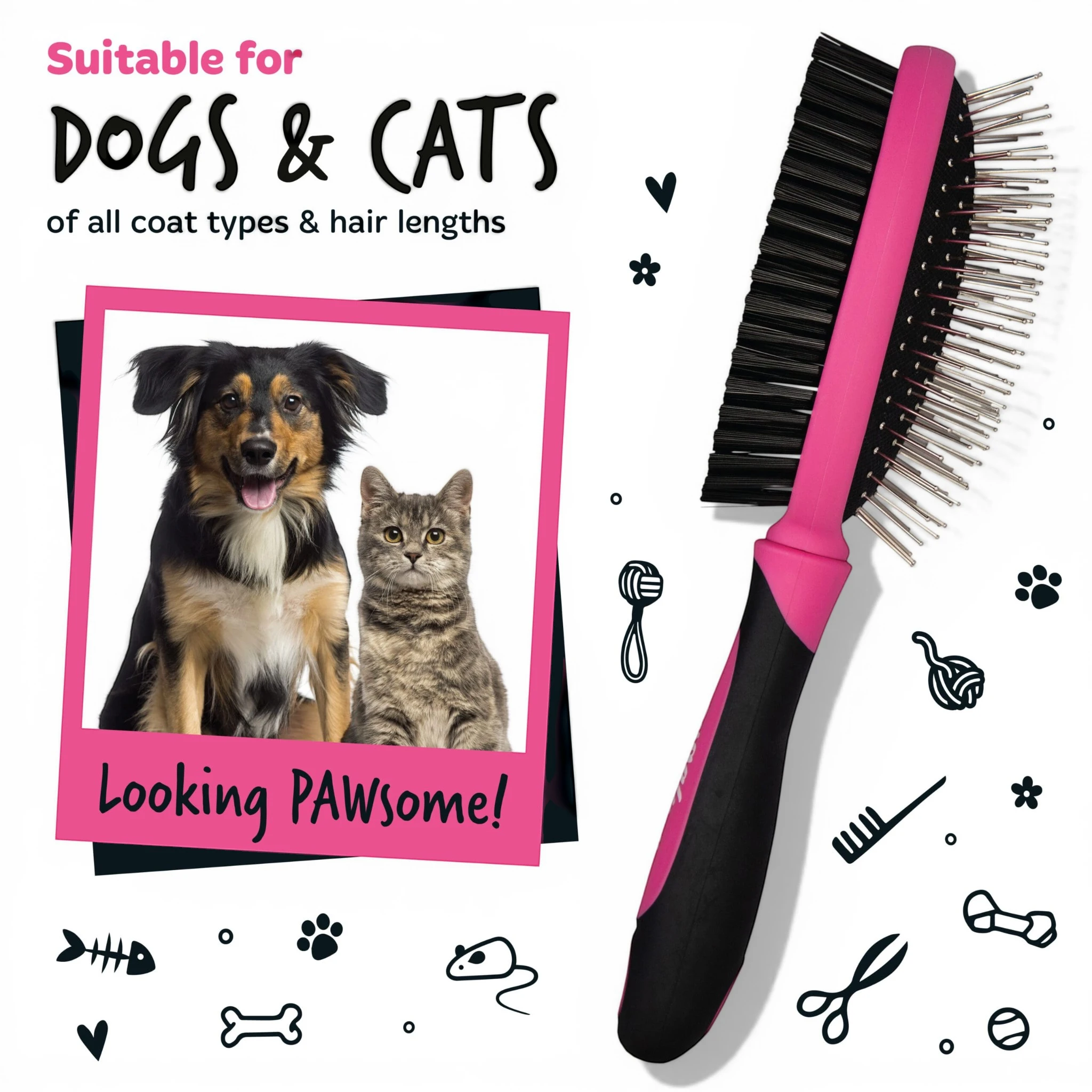 De dubbelzijdige borstel verwijdert vuil, losse haren en klitten terwijl de vacht wordt verzorgd en glad gemaakt.