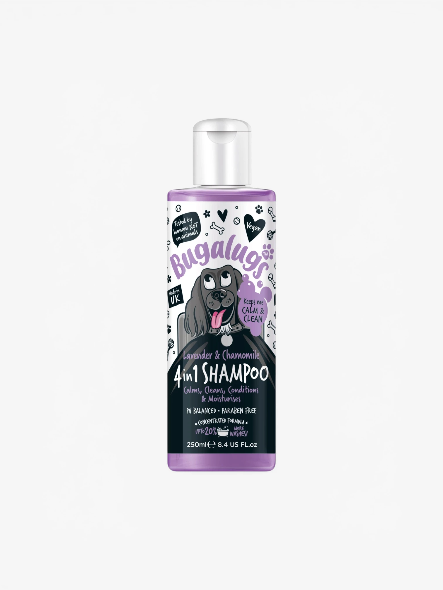 Bugalugs 4 In 1 Dog Shampoo Lavender Chamomile is een kalmerende alles-in-één formule die reinigt, verzorgt, hydrateert en ontspant. Ideaal voor honden die wassen spannend vinden of een gevoelige huid hebben.
