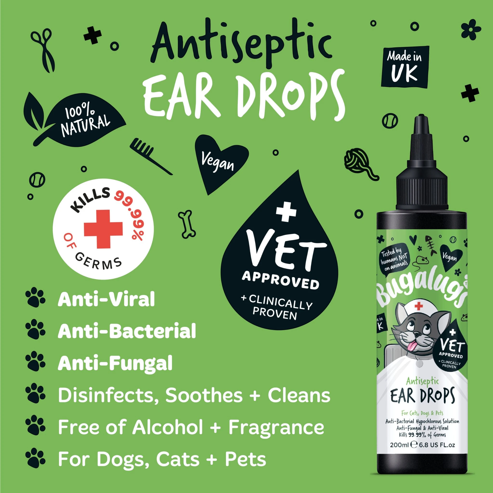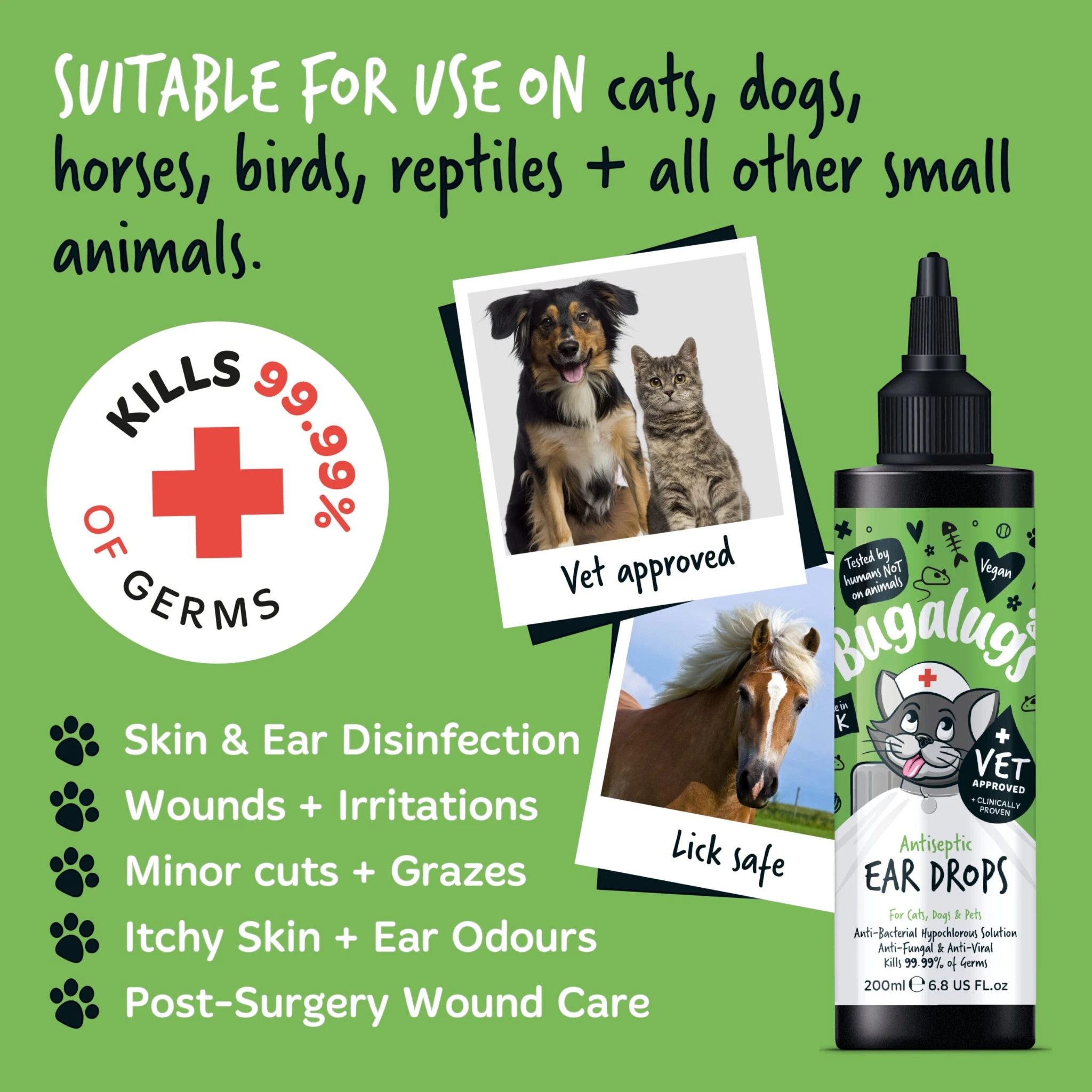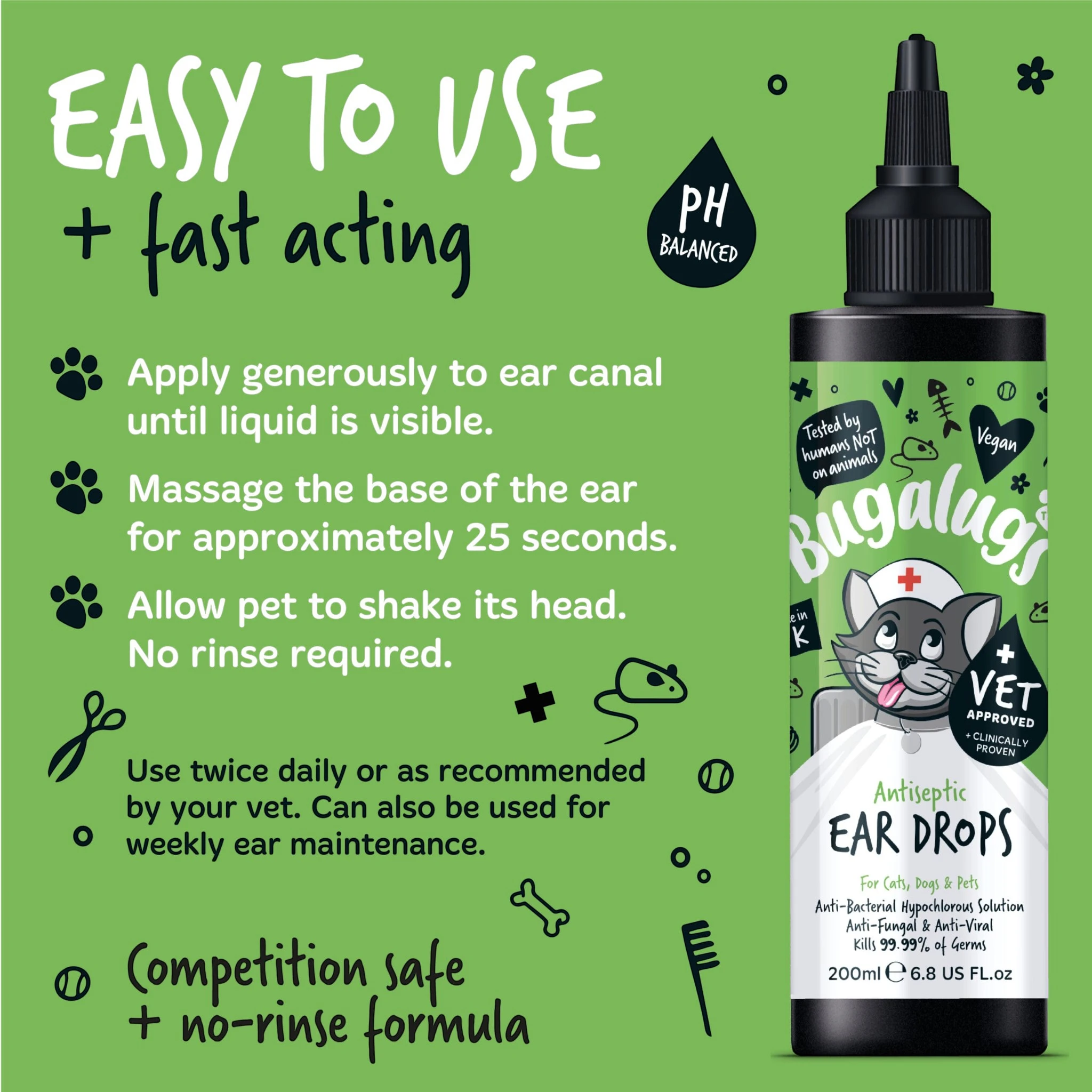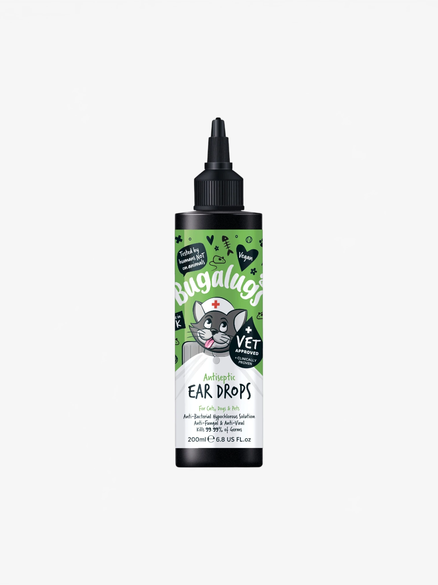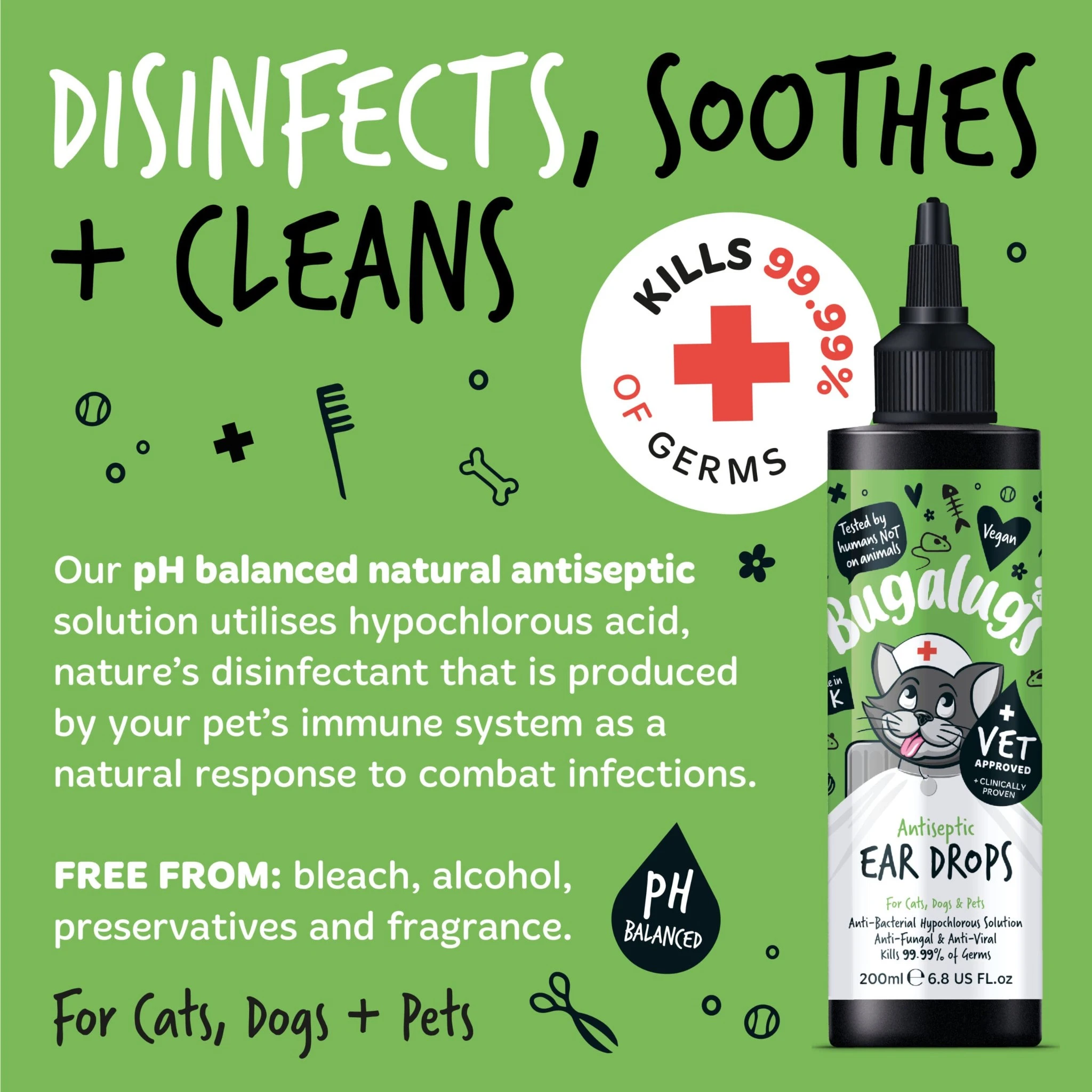 Bugalugs Antiseptic Ear Drops is een geavanceerde oplossing op basis van hypochloorzuur. Deze dermatologisch geteste en hypoallergene oordruppels hebben antibacteriële, antivirale en schimmelwerende eigenschappen.