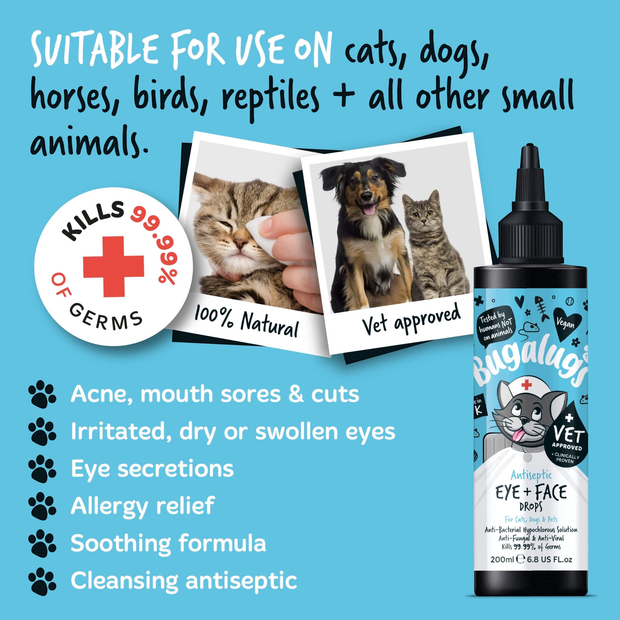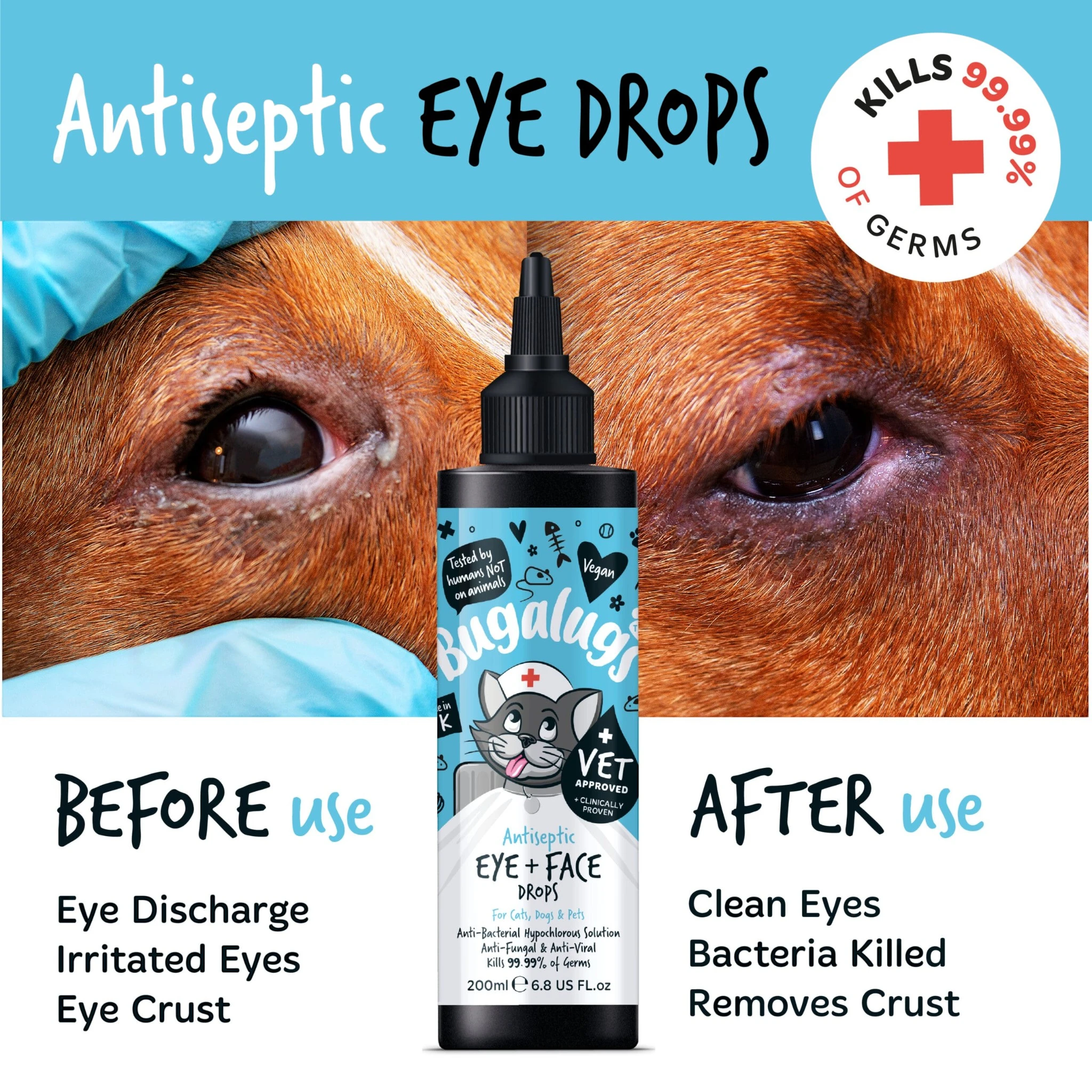Spoel irriterende stoffen voor de ogen weg met Bugalugs antiseptische oogdruppels. Deze geavanceerde oplossing maakt gebruik van hypochloorzuur om de ogen van uw huisdier te verzorgen.