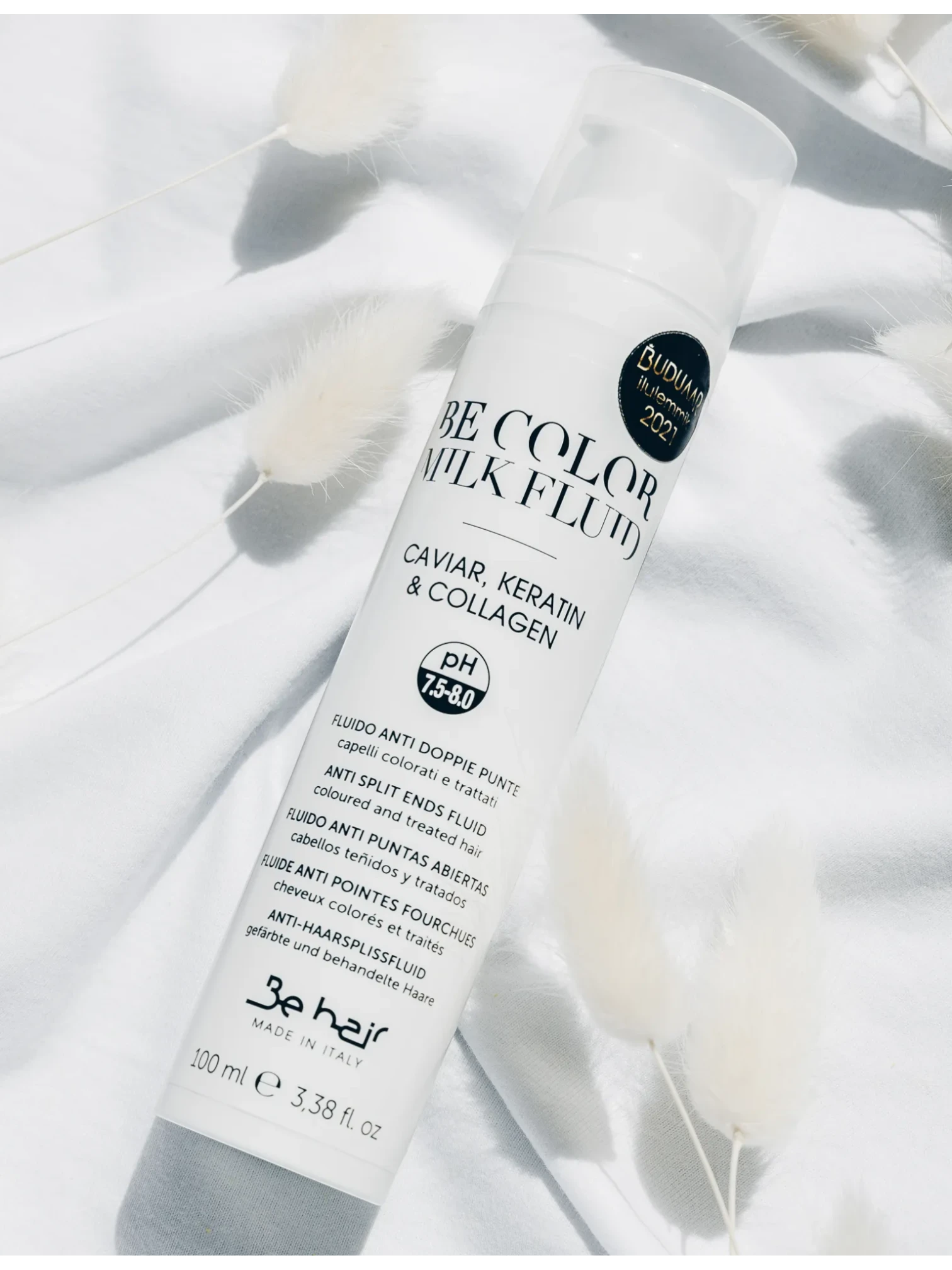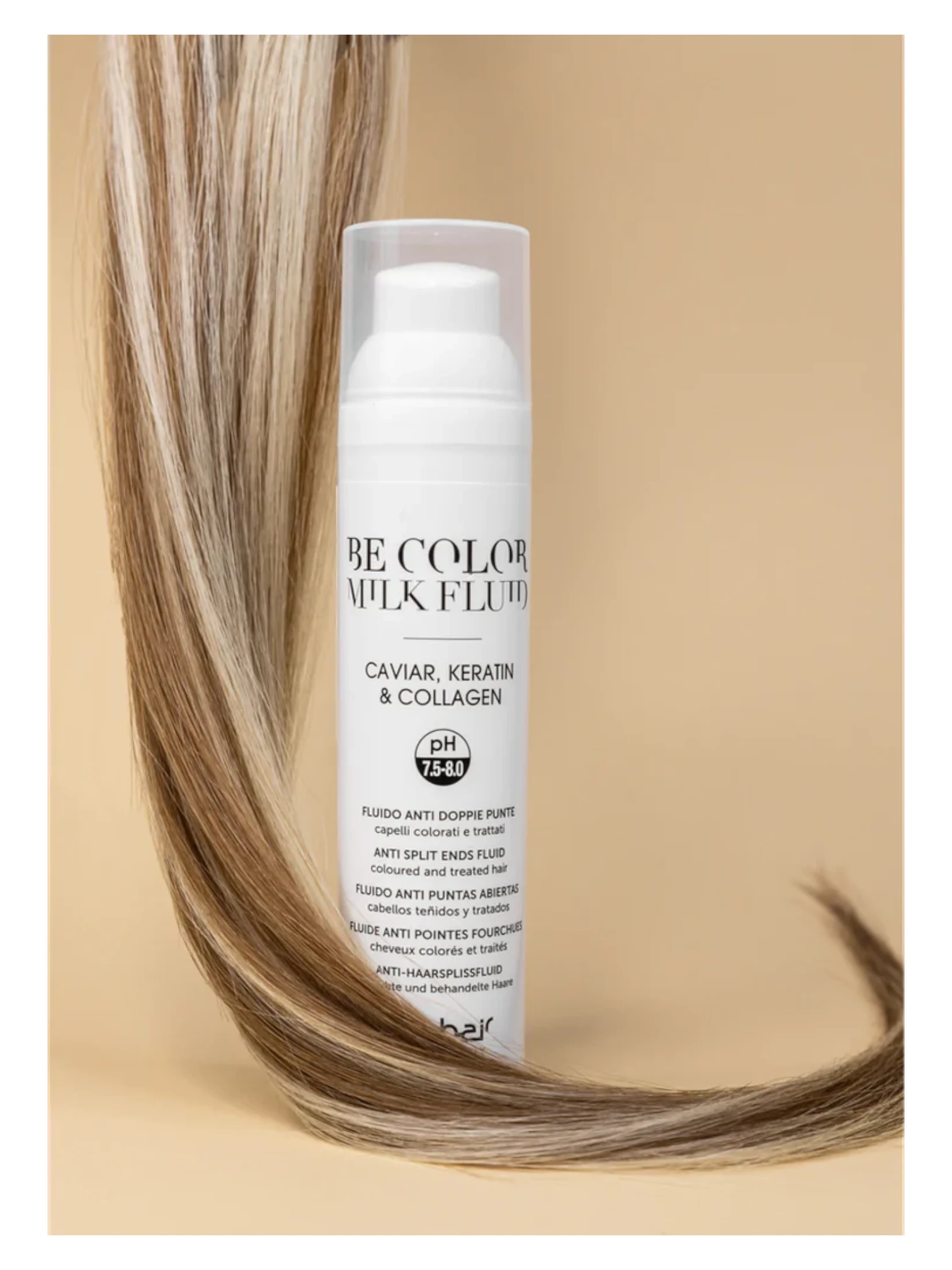 De milk fluid herstelt het haar en helpt gespleten haarpunten te voorkomen, waardoor het haar er gladder en sterker uitziet.