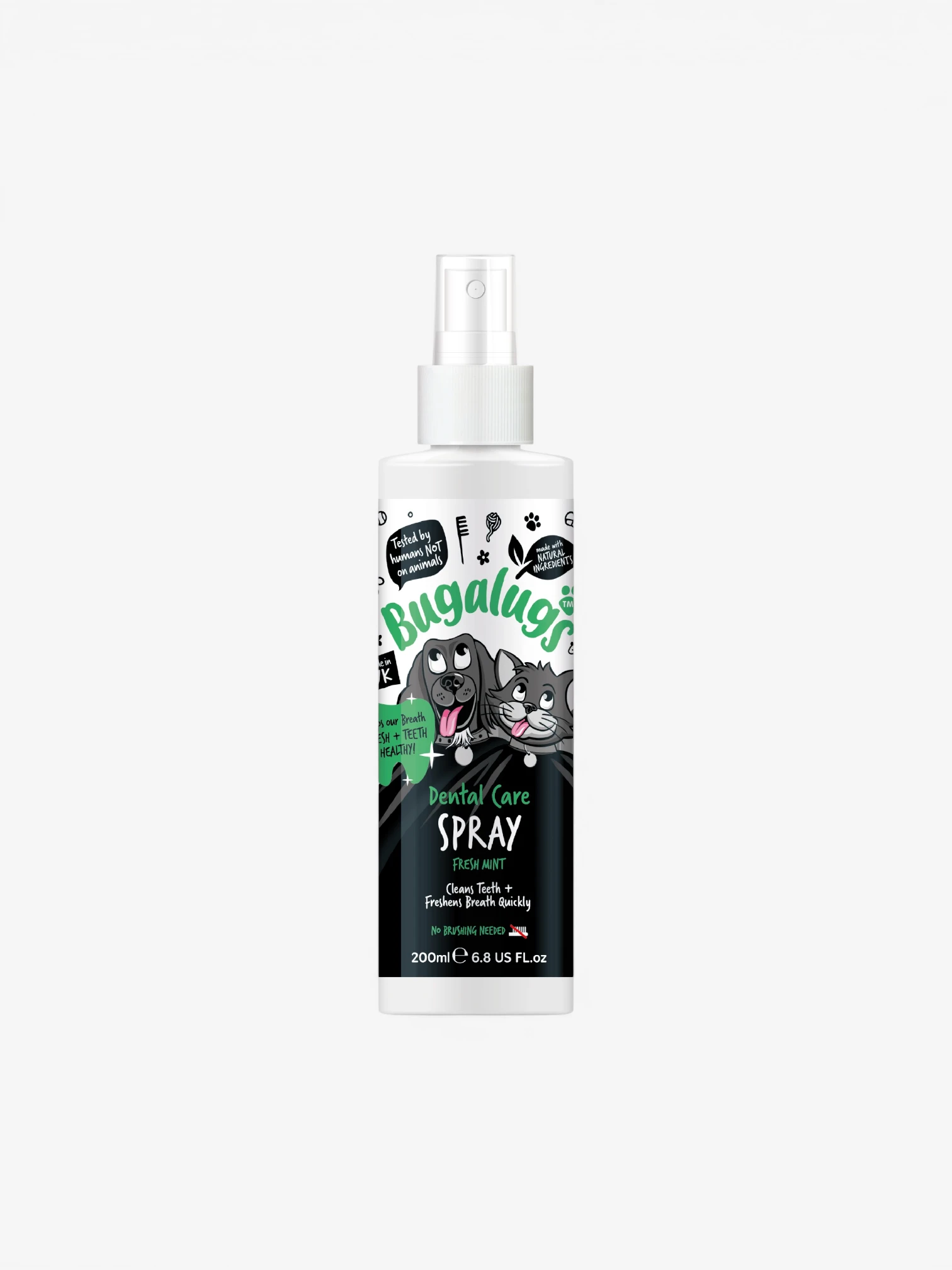 Bugalugs Dental Care Spray is een eenvoudige en effectieve oplossing voor de mondverzorging van je hond. Deze spearmint spray zorgt voor een frisse adem en helpt het gebit schoon te houden, zonder dat tandenpoetsen nodig is.