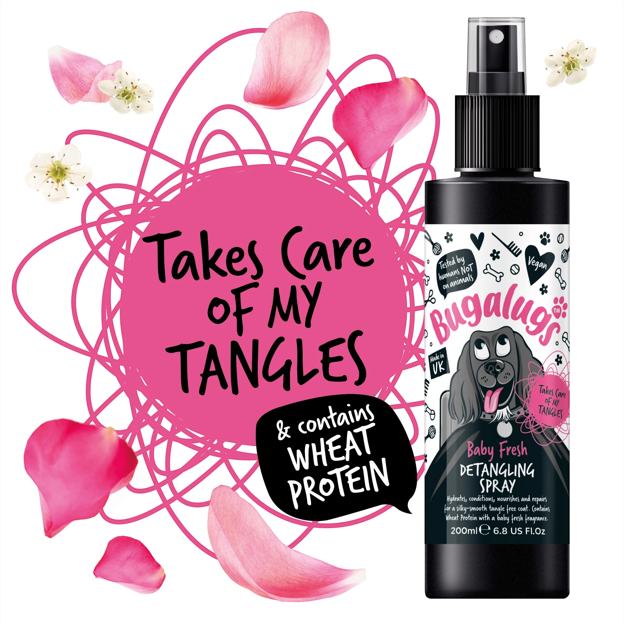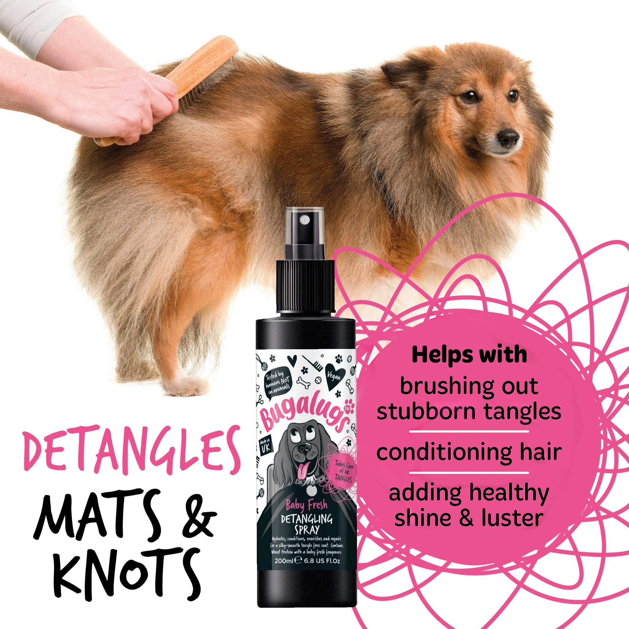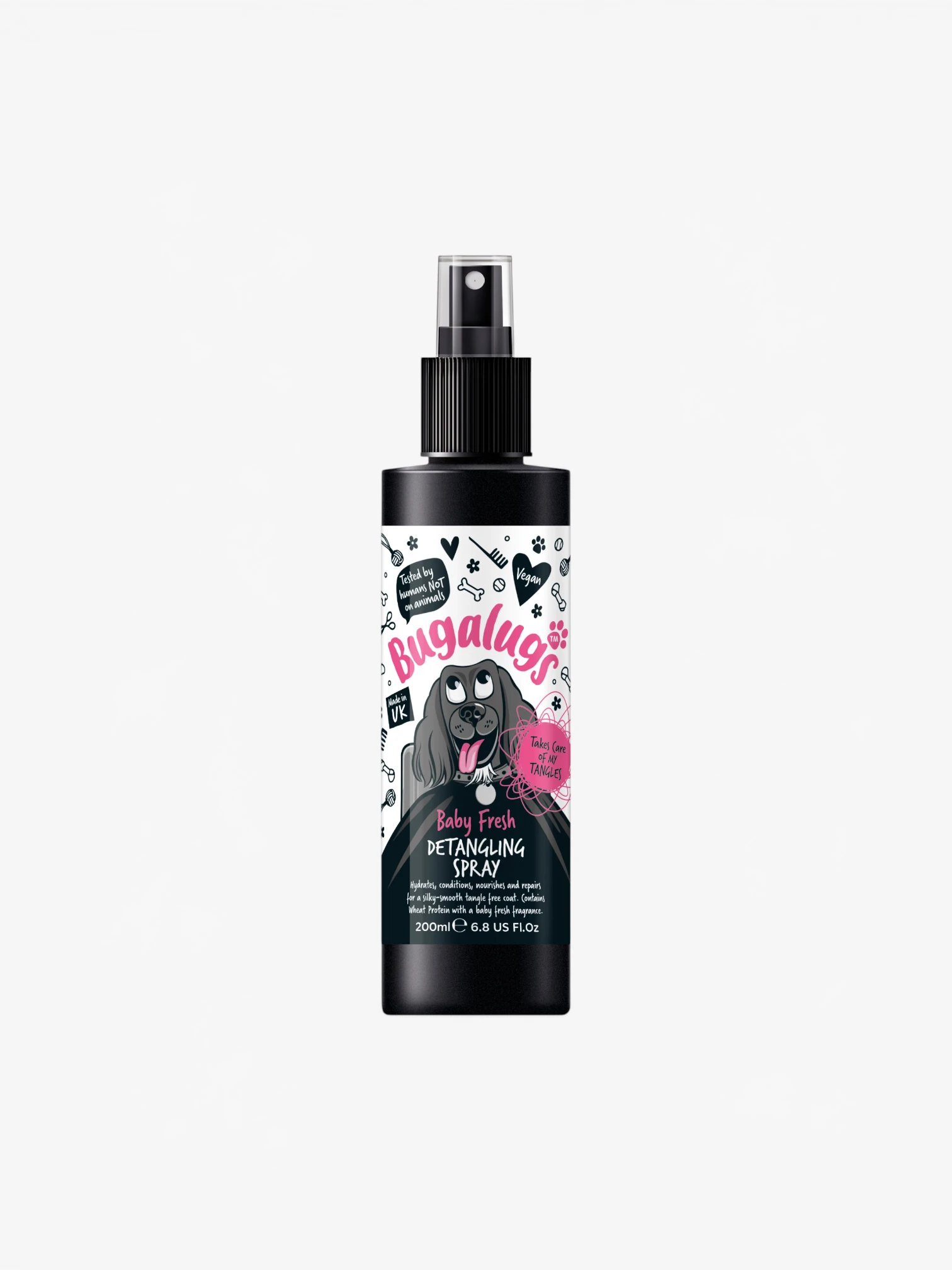 De Bugalugs Detangling Spray Baby Fresh is een effectieve anti-klitspray die helpt om hardnekkige knopen en klitten uit de vacht van je hond te verwijderen.