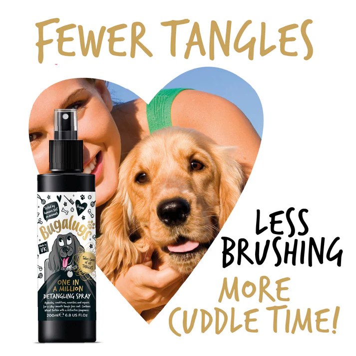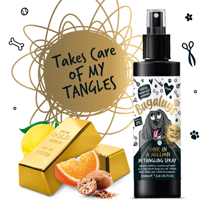 De Bugalugs Detangling Spray One In A Million is een pH-gebalanceerde, ontklittende en verzorgende spray die de vacht zijdezacht en glad maakt en hardnekkige knopen en klitten effectief ontwart.