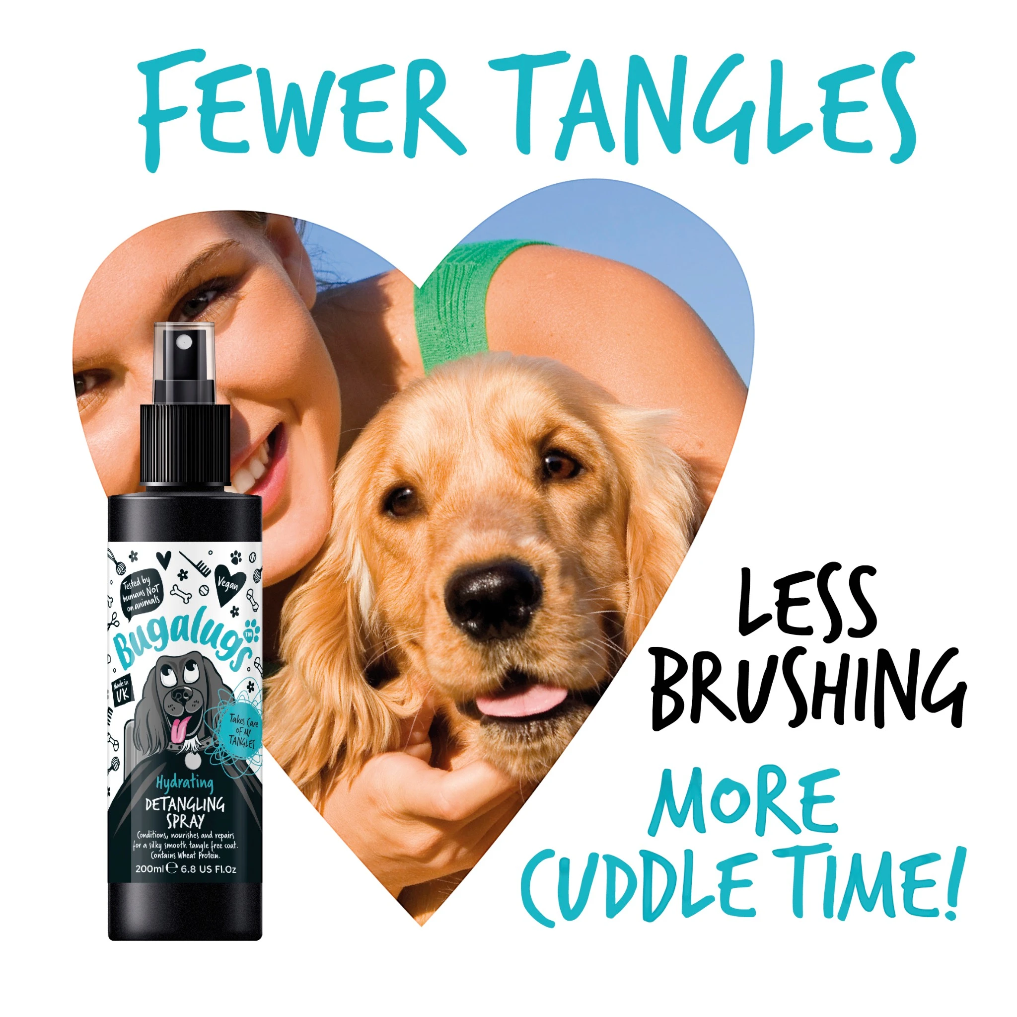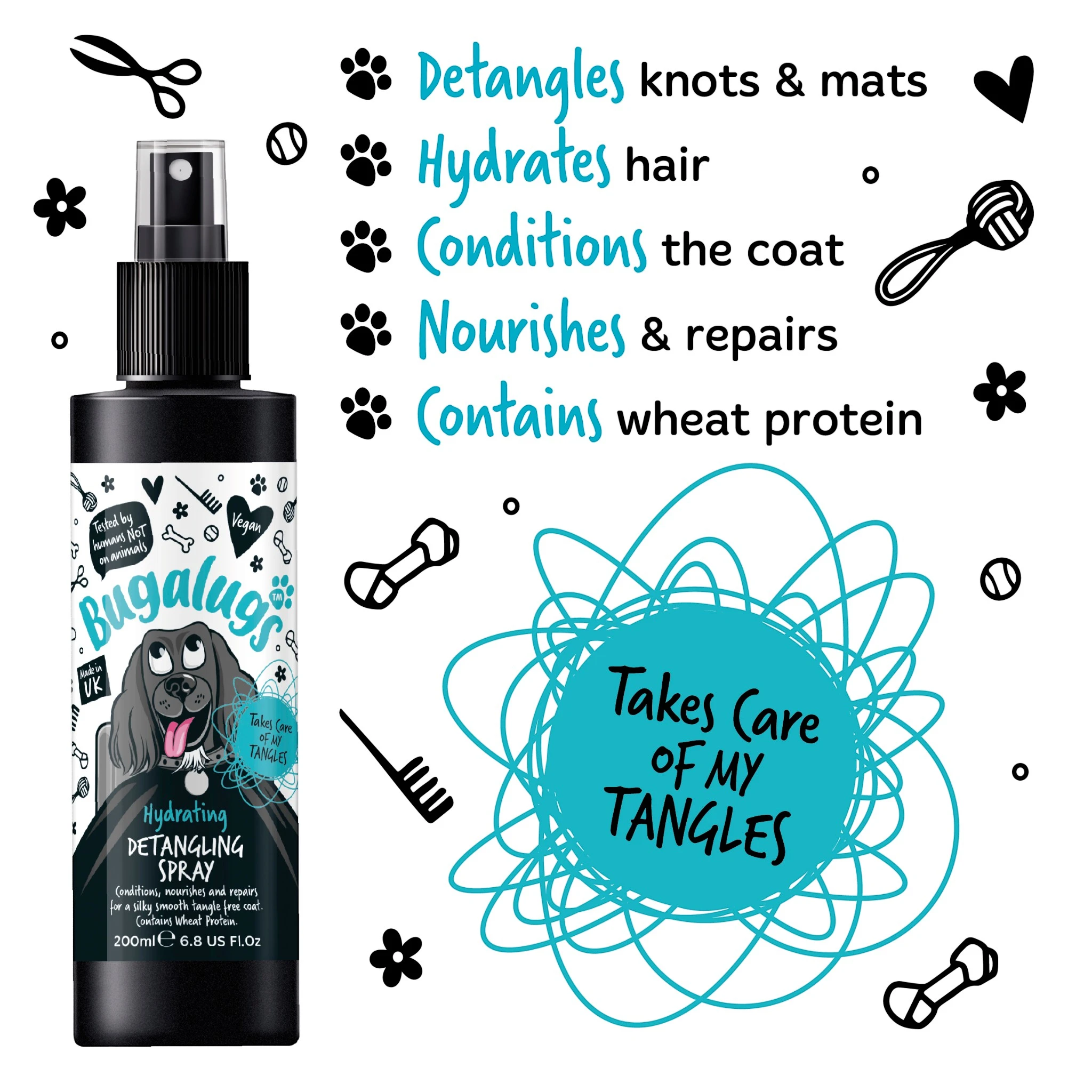 De antiklit-spray van Bugalug brengt weerbarstige haren in het gareel; dit vergemakkelijk de verzorging en verbetert de glans van de vacht.