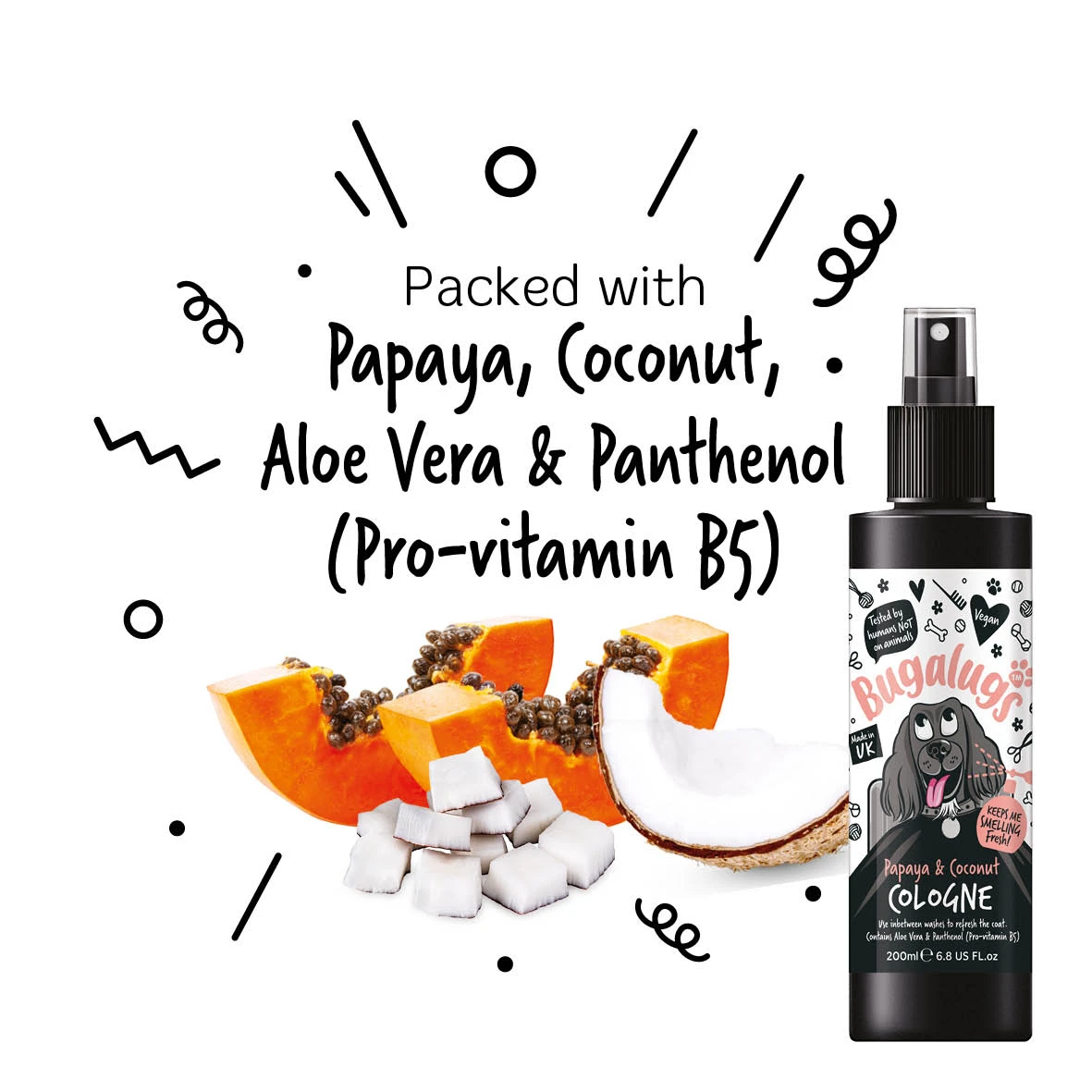 De Bugalugs Dog Cologne Papaya & Coconut is een verfrissende hondenspray met een tropische bestseller geur die de vacht direct laat stralen en heerlijk laat ruiken. Perfect voor een snelle opfrisbeurt tussen wasbeurten door.