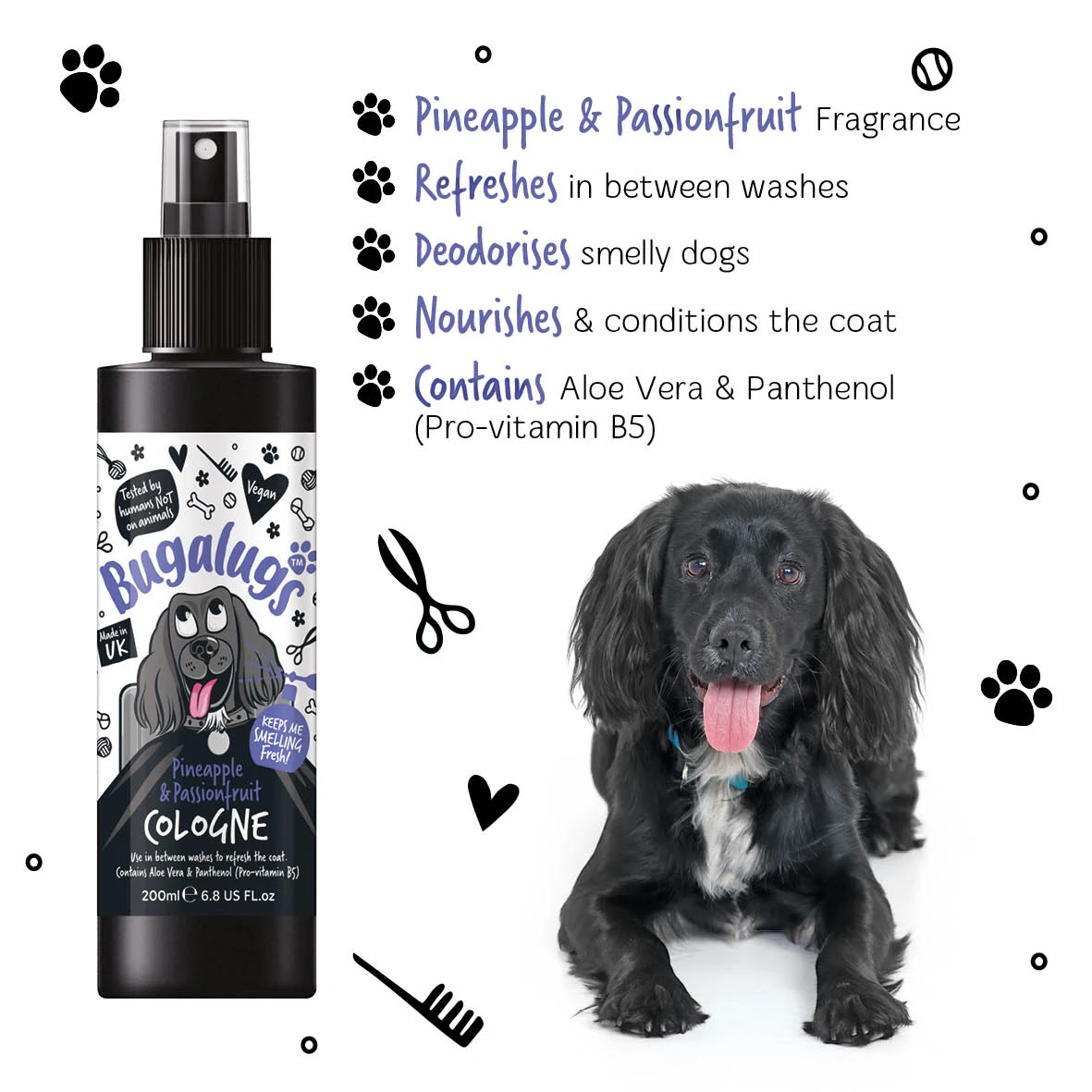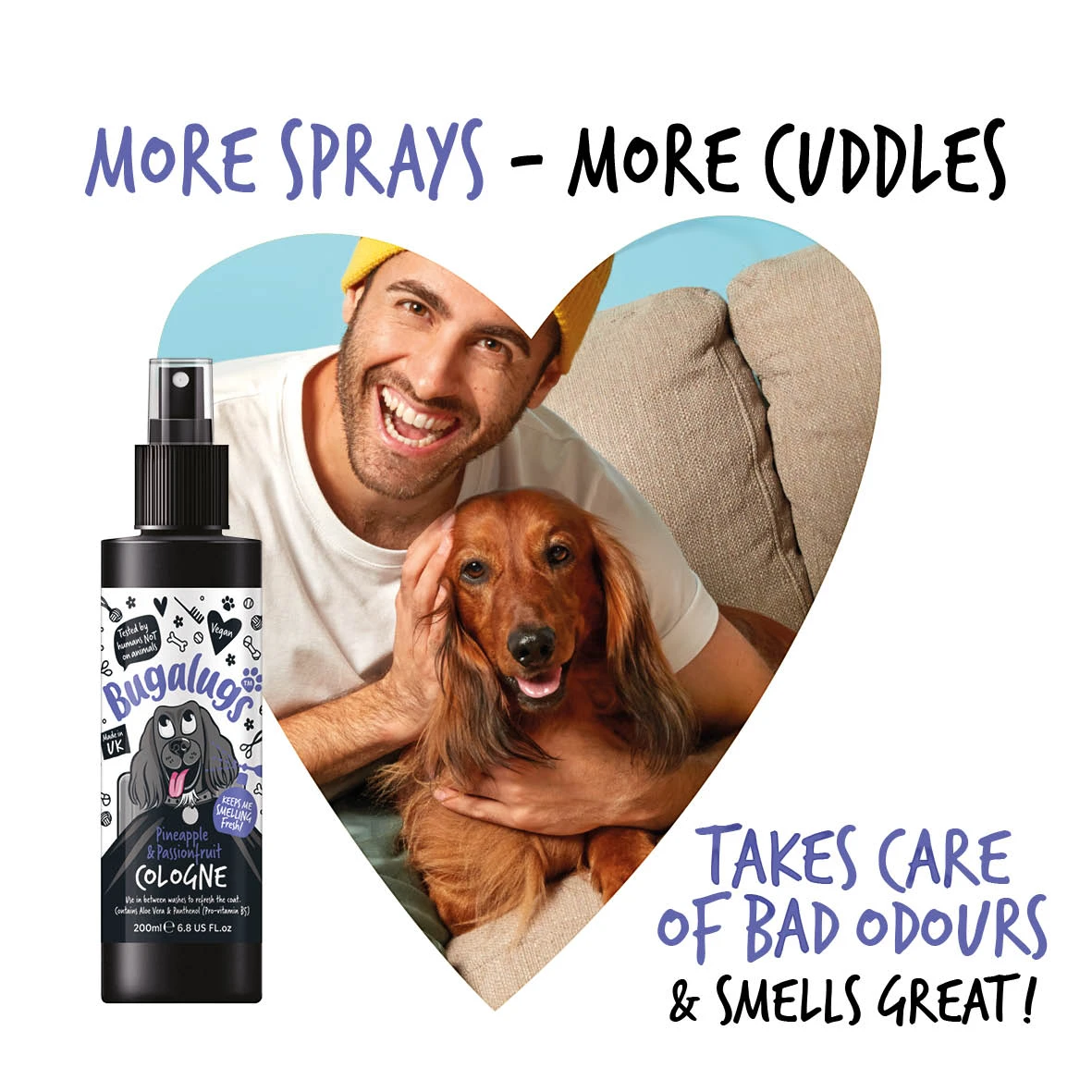 Spray en ga, met Bugalugs Ananas & Passievrucht Cologne! Verwijder snel geurtjes en laat je huisdier onweerstaanbaar ruiken.