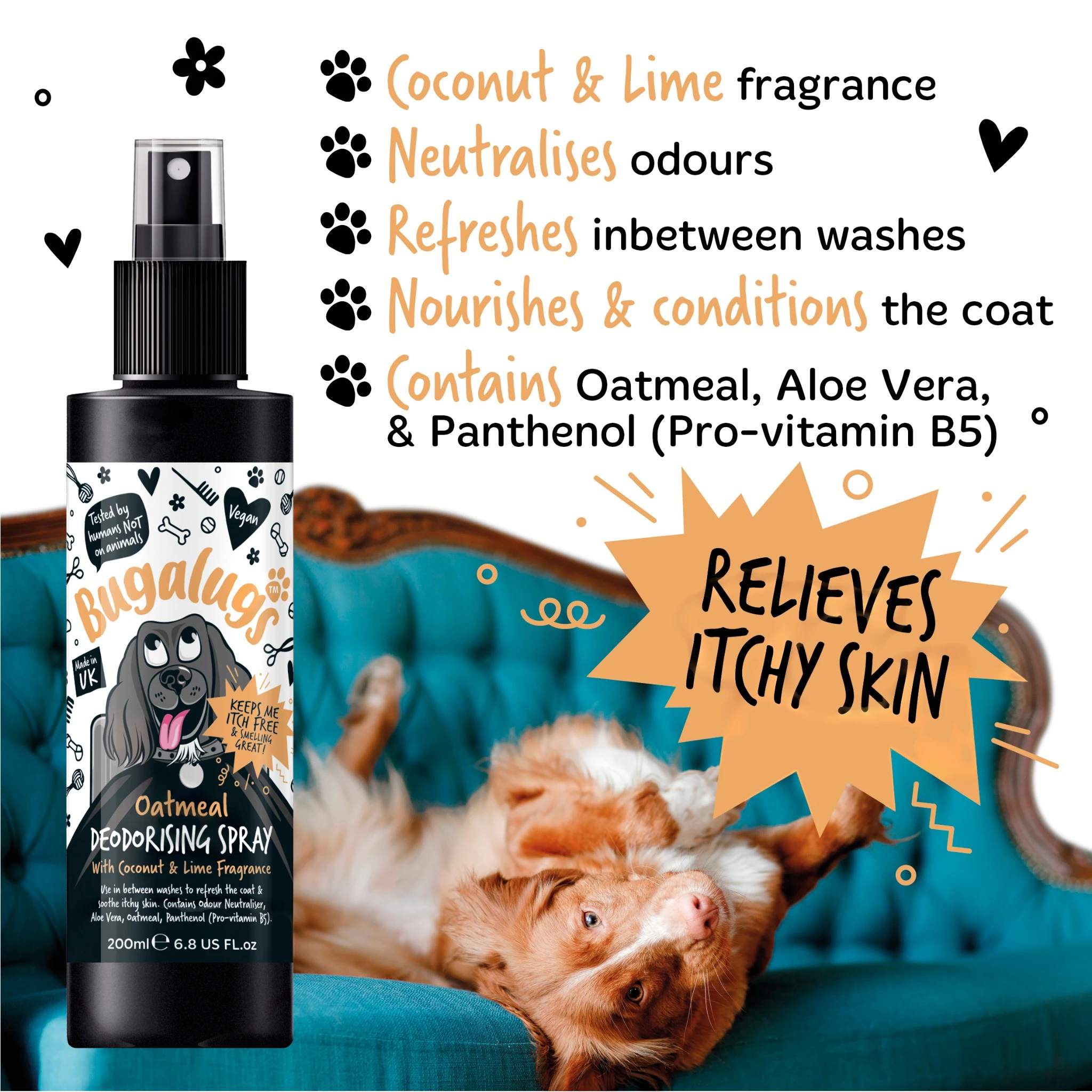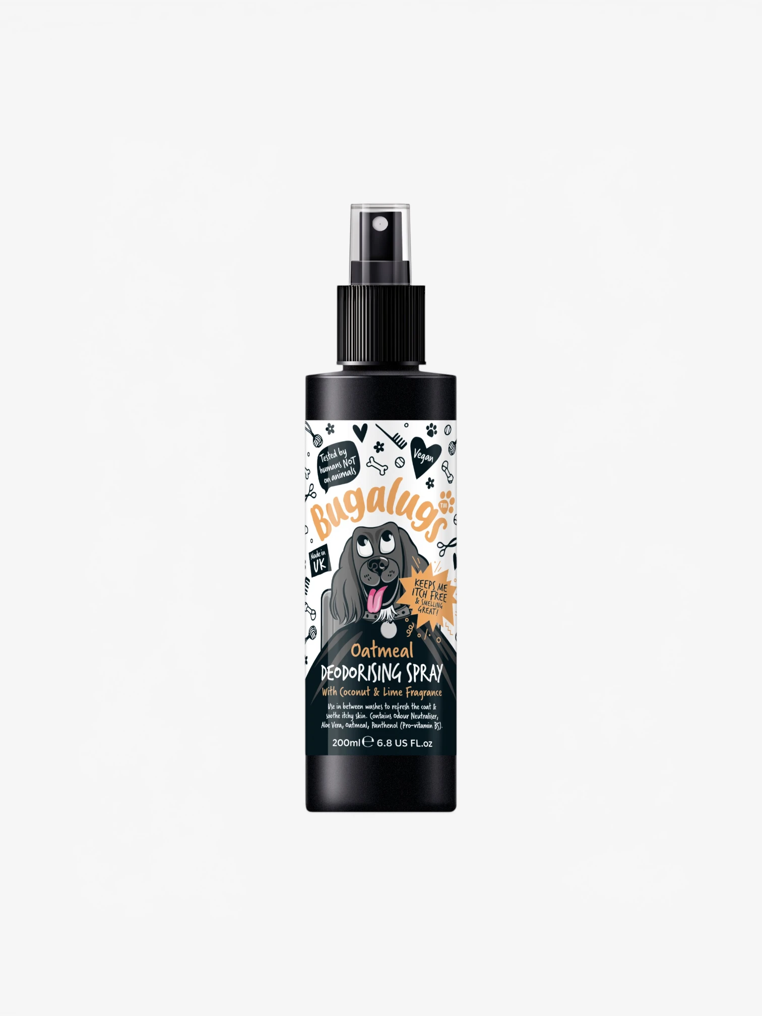 De Bugalugs Dog Deodorising Spray Oatmeal & Aloe is een verzorgende en verfrissende hondenspray die nare geurtjes effectief verwijdert en de vacht een langdurig frisse geur geeft.