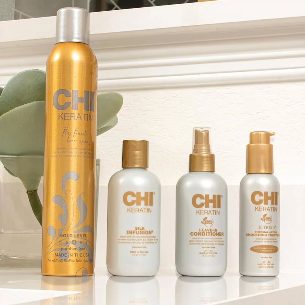 Creëer een natuurlijke, flexibele styling met de CHI Keratin Flexible Hold Hairspray. Deze lichtgewicht haarspray biedt een zachte fixatie zonder het haar te verzwaren, terwijl het tegelijkertijd wordt verzorgd en versterkt.