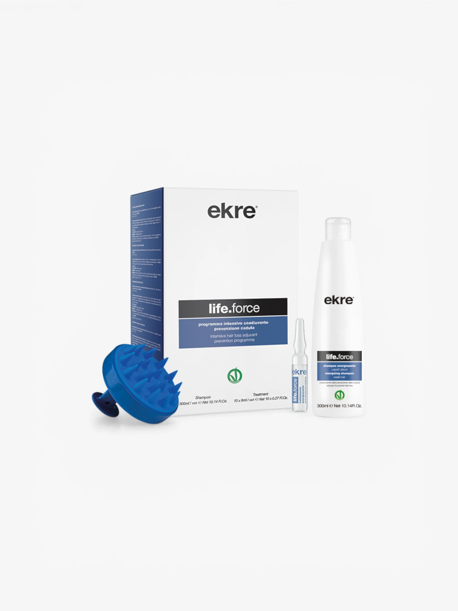 Ekre Life.Force Energising Treatment Kit is een complete revitaliserende behandeling voor zwak en dun haar. Deze professionele set combineert een stimulerende shampoo, intensieve ampullenbehandeling en een hoofdhuidmassager om haaruitval tegen te gaan en het haar sterker, voller en gezonder te maken.