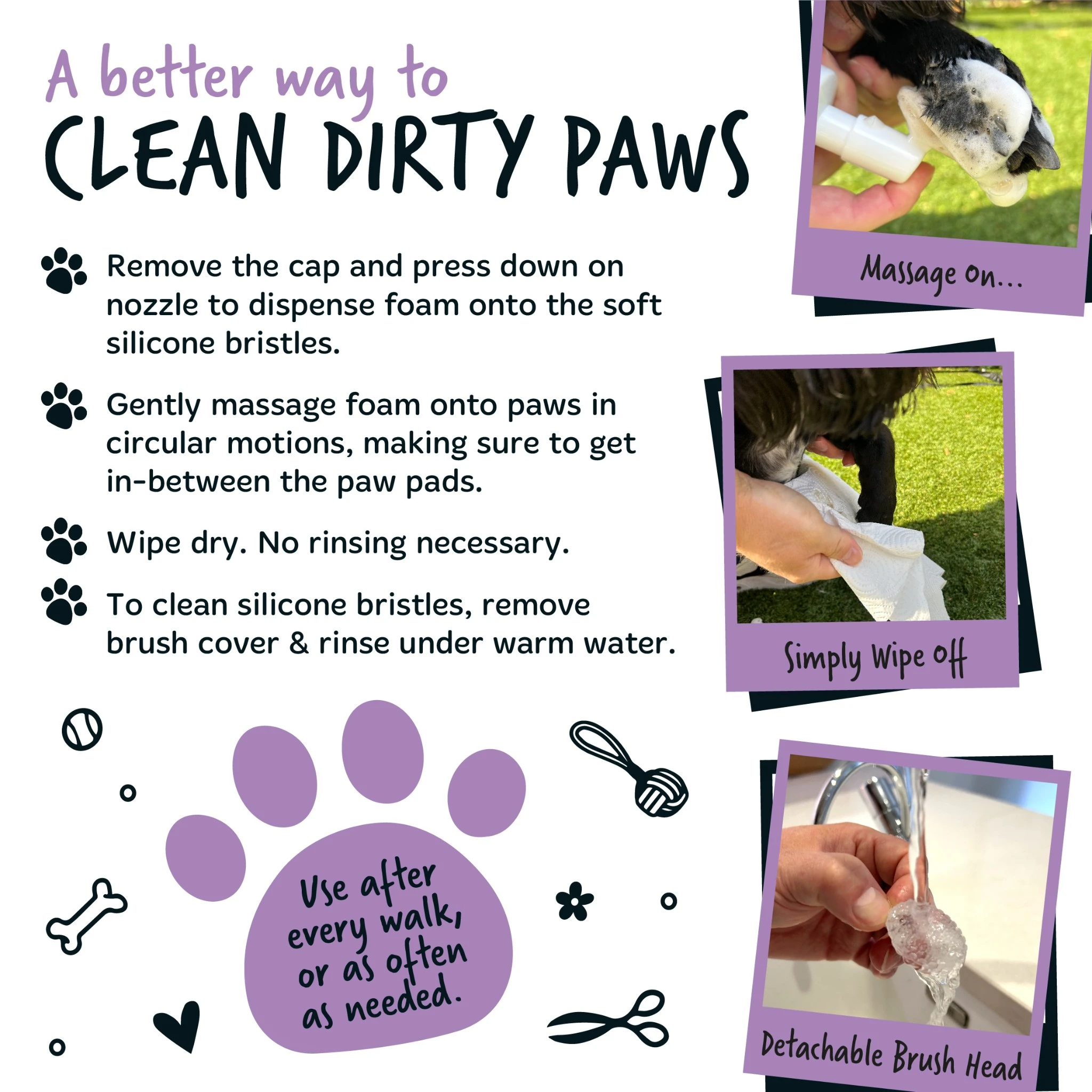 De schuimende formule wordt via de borstel direct op de poten aangebracht en dringt door tot diep tussen de tenen om vuil los te maken en te verwijderen.