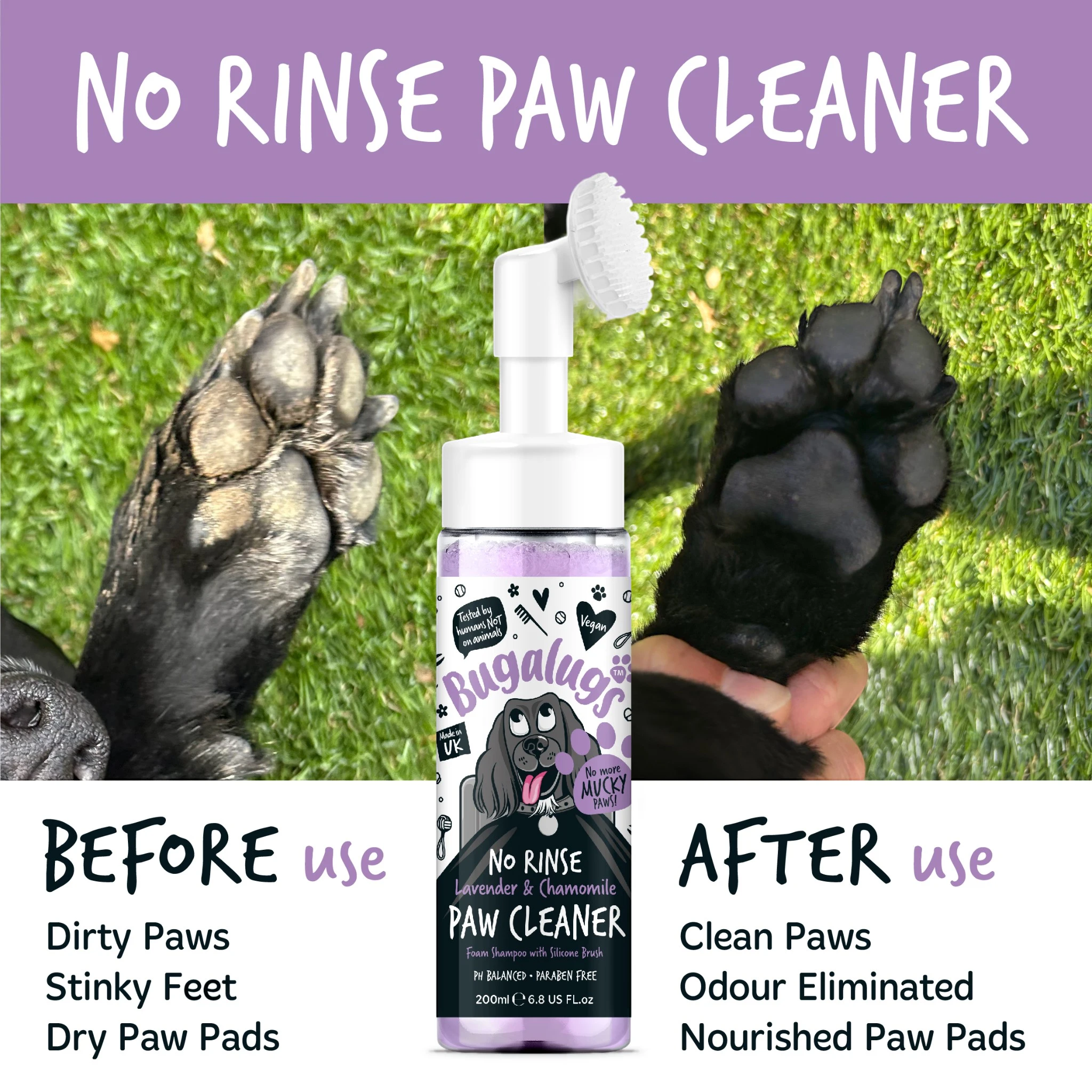 Zeg vaarwel tegen modderige, droge en geïrriteerde poten met Bugalugs No Rinse Paw Cleaner – de ultieme oplossing om de poten van uw huisdier schoon en fris te houden zonder het gedoe van traditioneel wassen.
