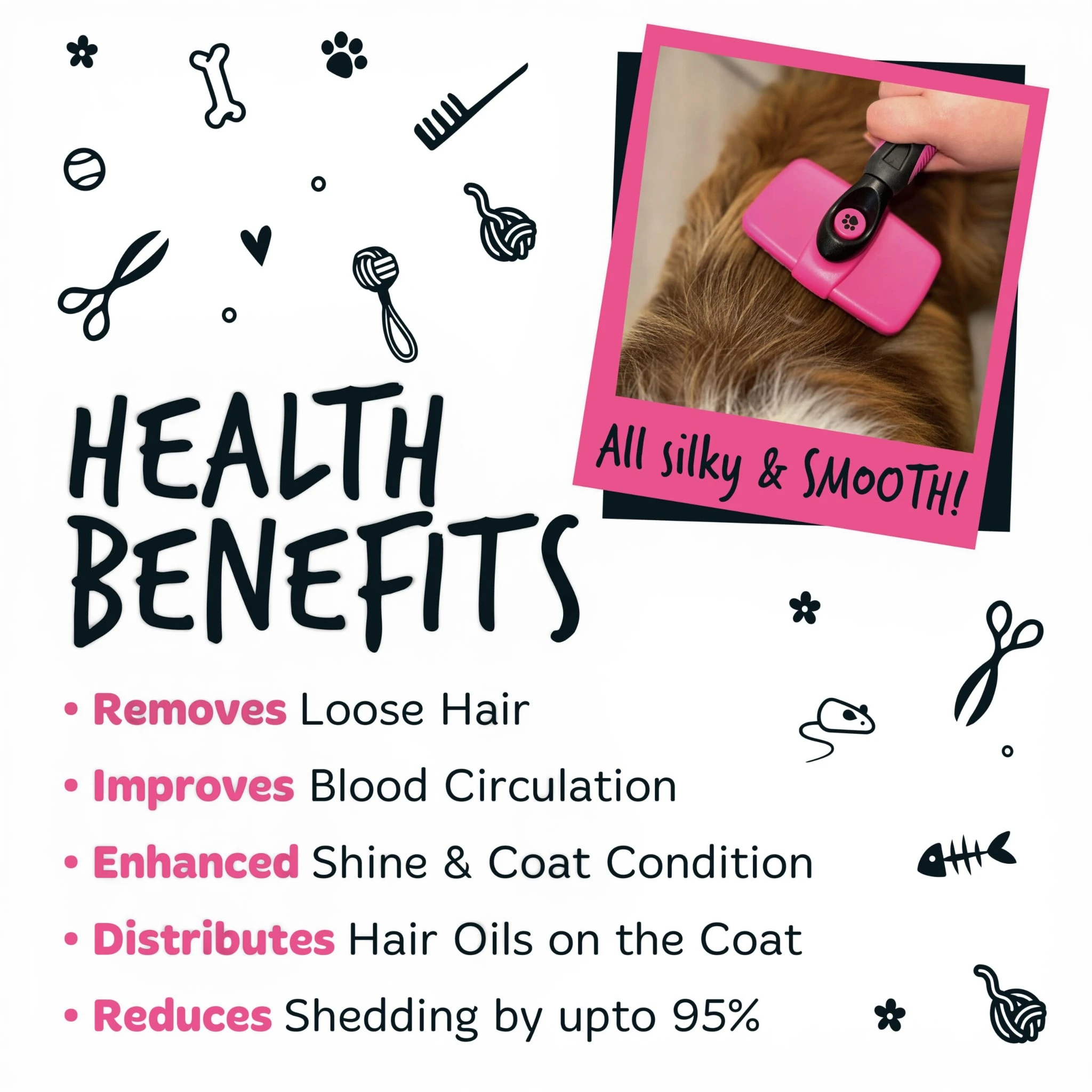 De borstel verwijdert losse haren, vuil en klitten uit de vacht terwijl deze tegelijkertijd wordt verzorgd.