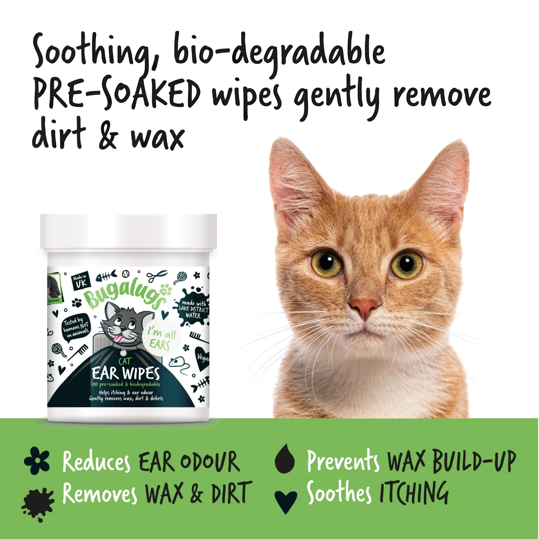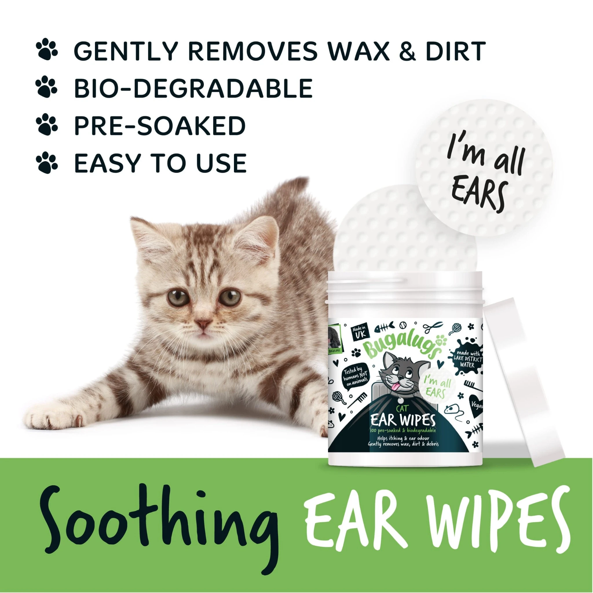 Bugalugs Soothing Ear Wipes voor katten helpen de oren van je kat schoon, fris en gezond te houden. De zachte, voorgeweekte doekjes verwijderen vuil en oorsmeer op milde en effectieve wijze zonder de gevoelige huid te irriteren.