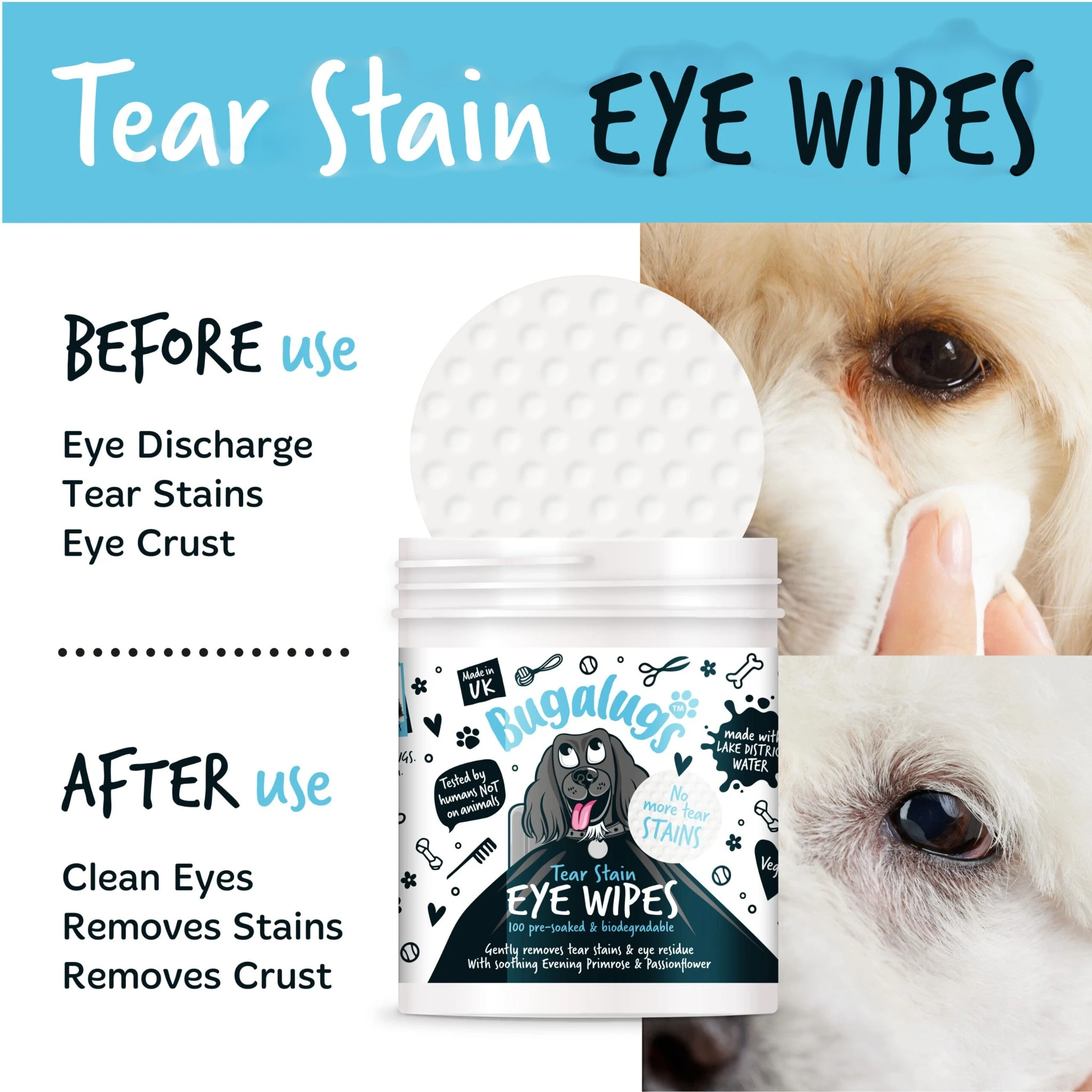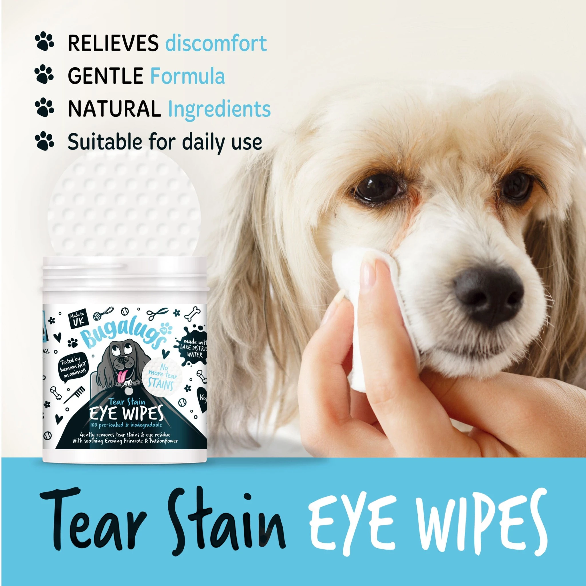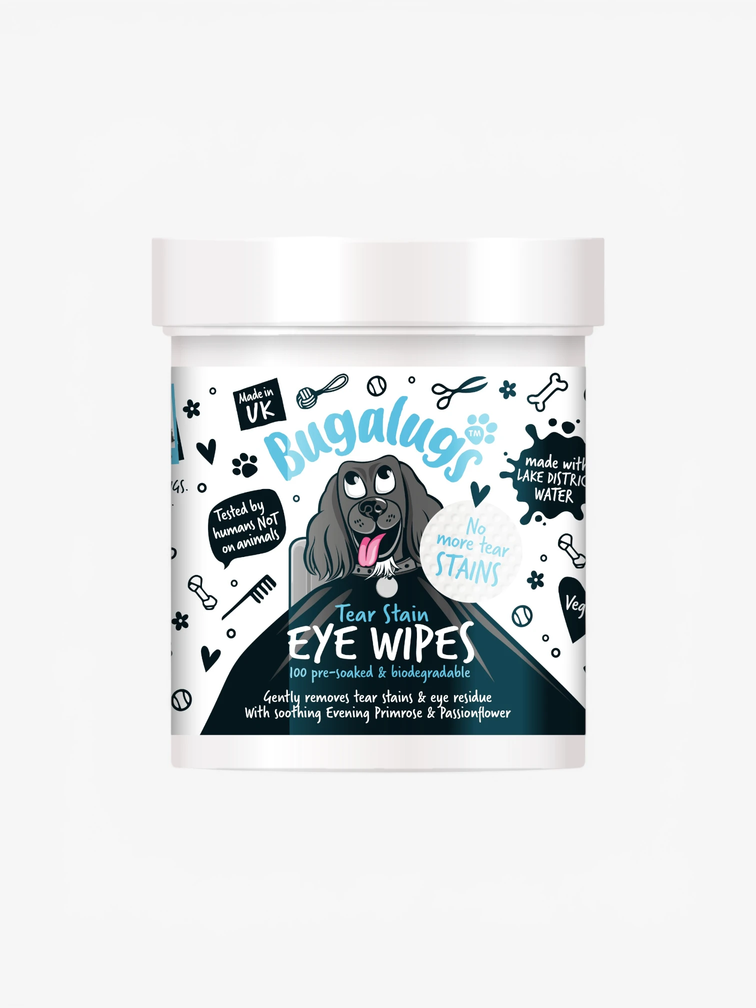 Bugalugs Eye Wipes helpen de ogen van uw hond schoon en gezond te houden. Onze natuurlijke formule verwijdert op een zachte en effectieve manier traanvlekken en andere afscheiding.