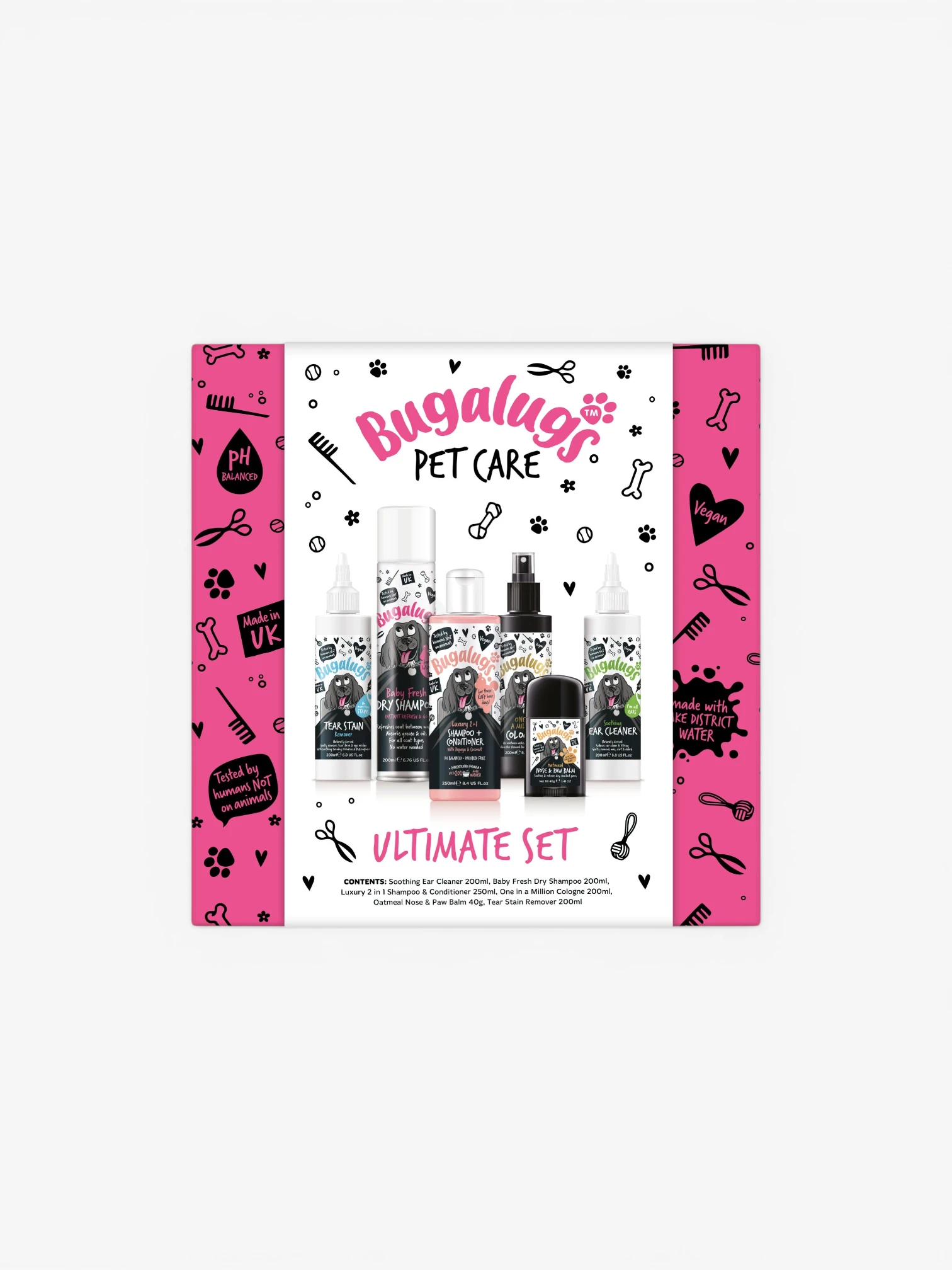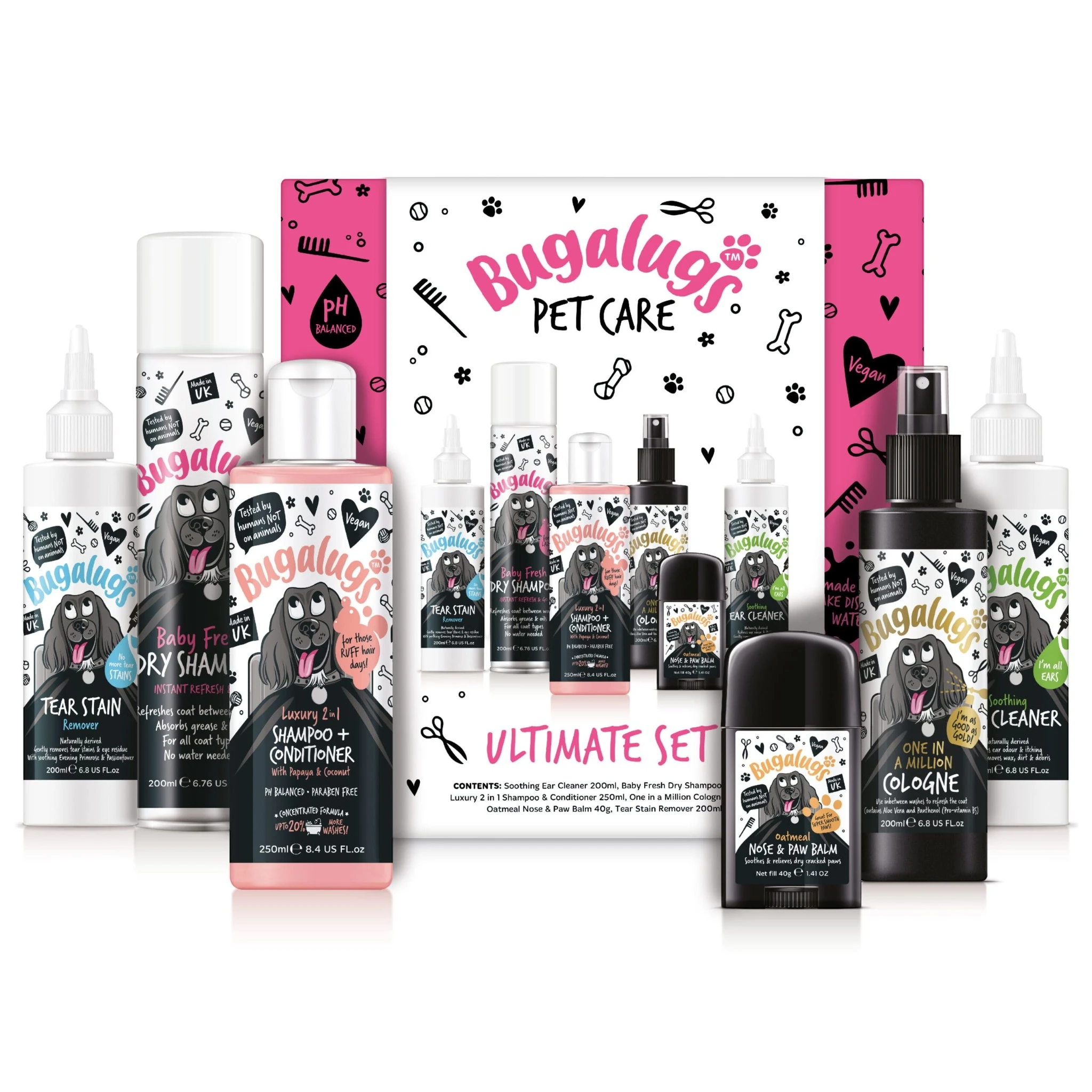 Verwen je hond met de Bugalugs Ultimate Gift Set. Deze complete verzorgingsset bevat een selectie van bestverkochte producten waarmee je hond er schoon, verzorgd en heerlijk fris uitziet.