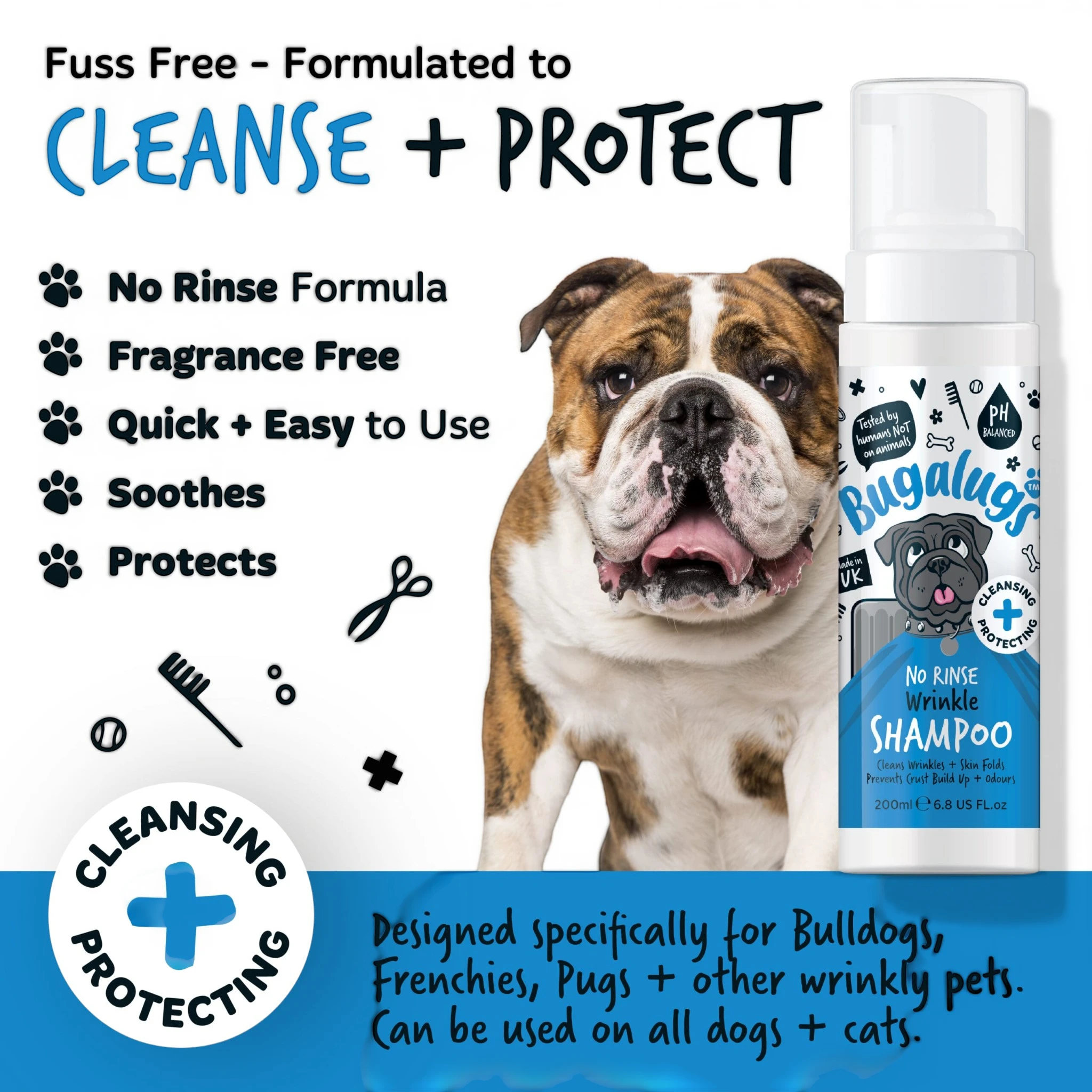 Bugalugs No Rinse Wrinkle shampoo is ontworpen om rimpels, huidplooien, scheurvlekken en staartzakken te reinigen, waardoor korstvorming en geurtjes worden voorkomen.