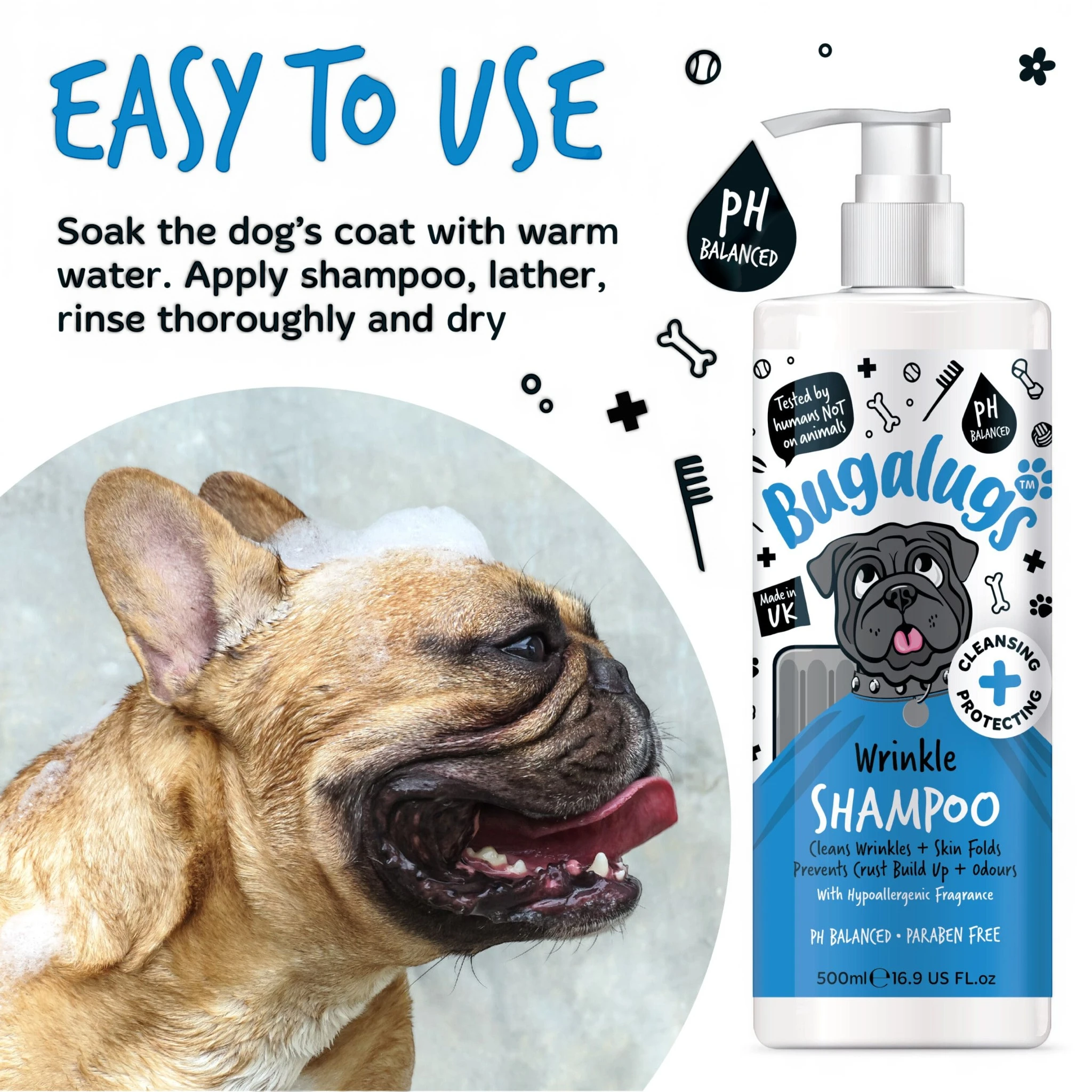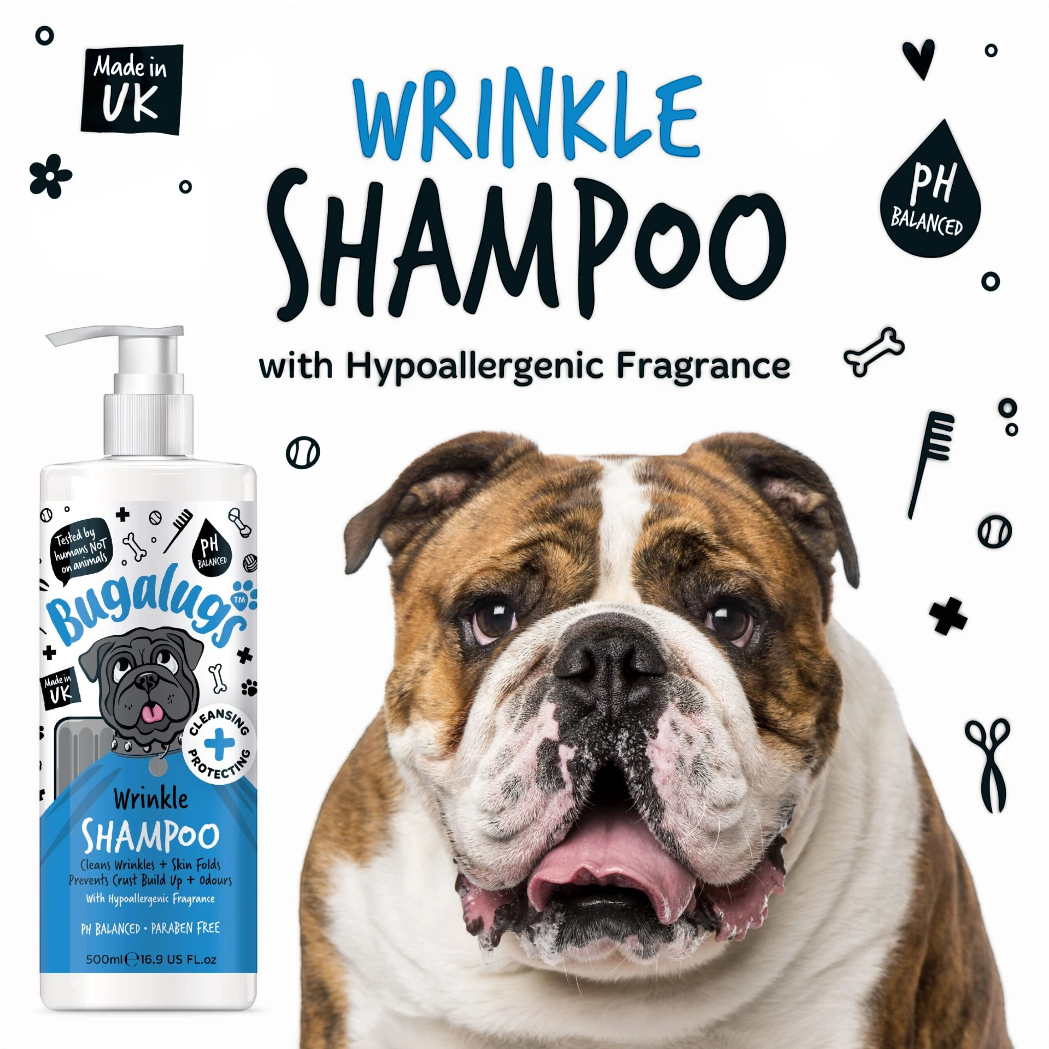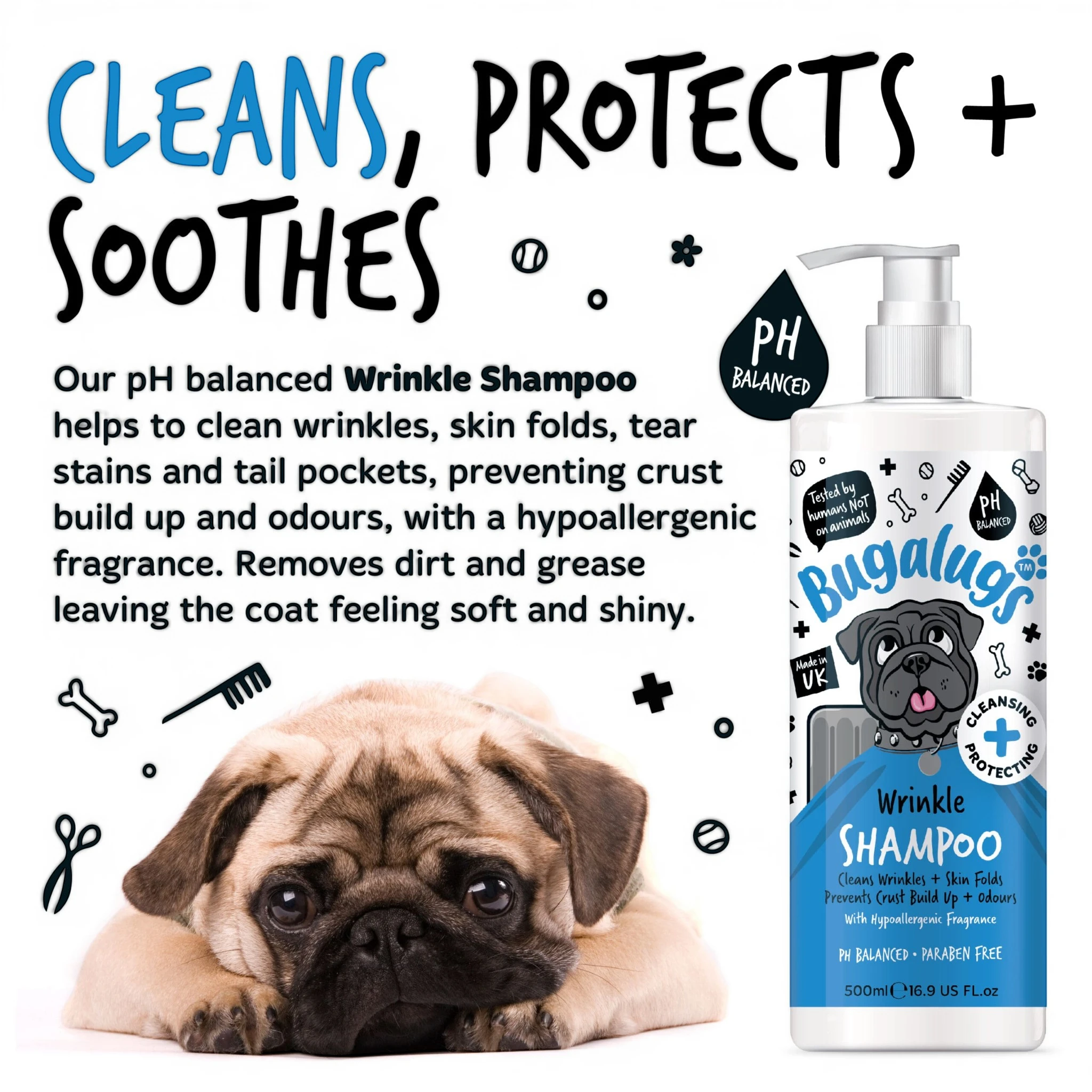 Bugalugs Wrinkle Shampoo is speciaal ontwikkeld voor honden met huidplooien en gevoelige huid. Deze milde shampoo reinigt grondig en helpt rimpels schoon, fris en vrij van irritaties te houden.